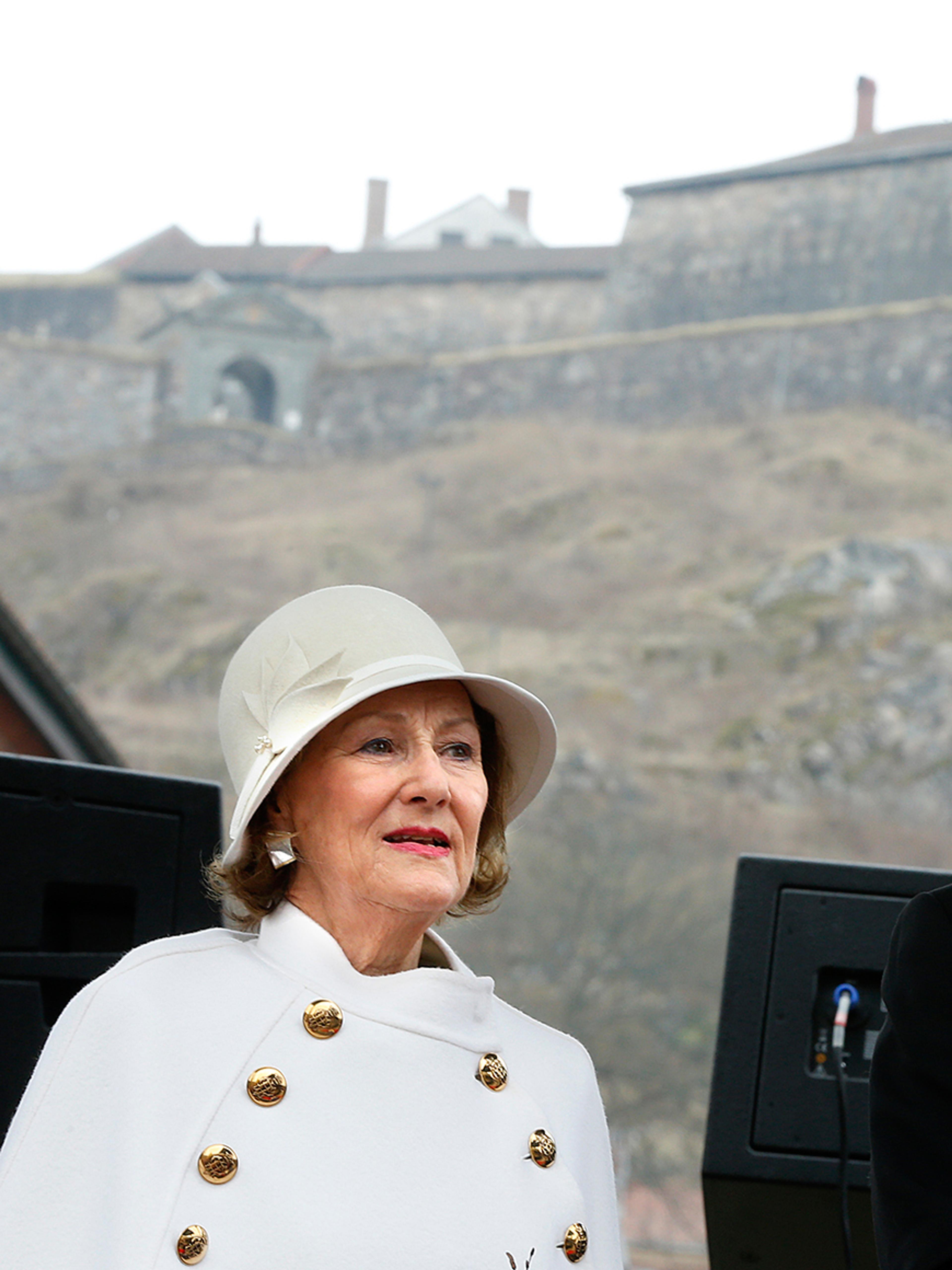 Dronning Sonja fikk blomster fra andreklassingene Julie Fredén Westby og Leon Torpangen da hun ankom torget i Halden i formiddag. Barnetoget marsjerte, og både musikkorpset og kulturskolen underholdt. Nasjonalsangen og Kongesangen ble sunget før Gaute Jacobsen, direktør for Halden Historiske Samlinger, fortalte om byprivilegiet.
