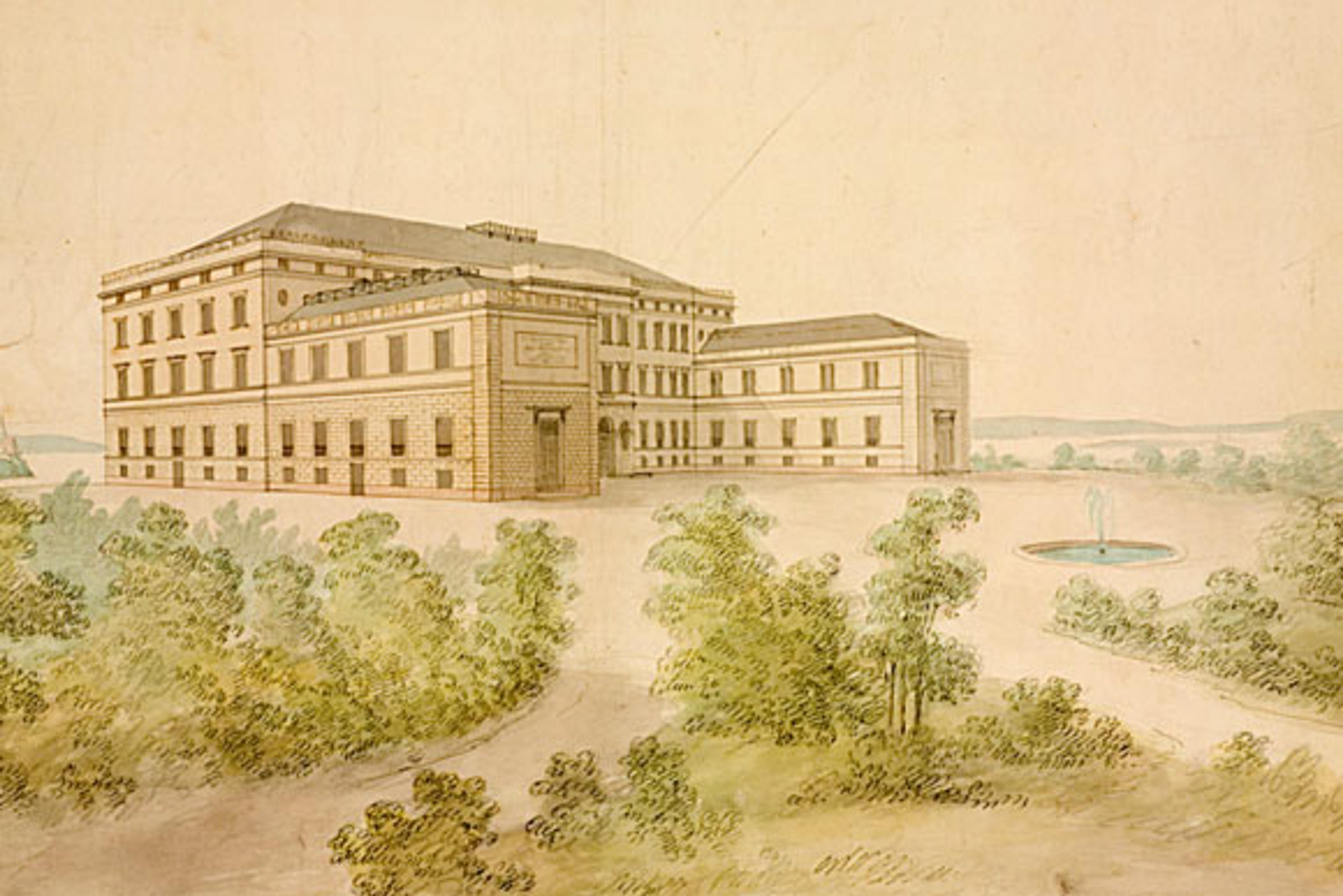Tomten ble sprengt ut, og grunnmuren sto ferdig i 1827, men da var pengene nesten brukt opp. Stortinget stemte mot å bevilge mer til prosjektet, og mellom 1827 og 1833 sto byggearbeidene stille.