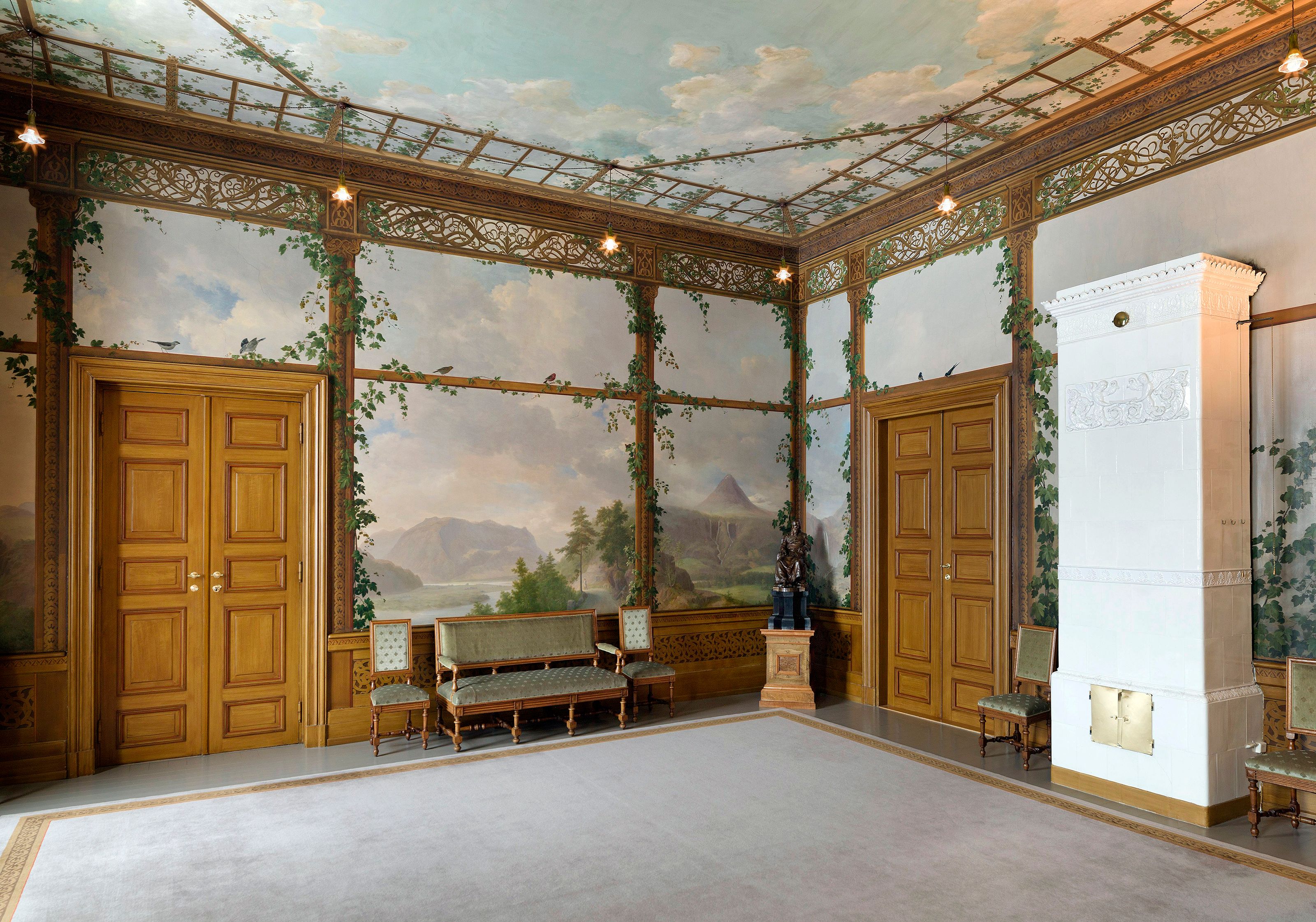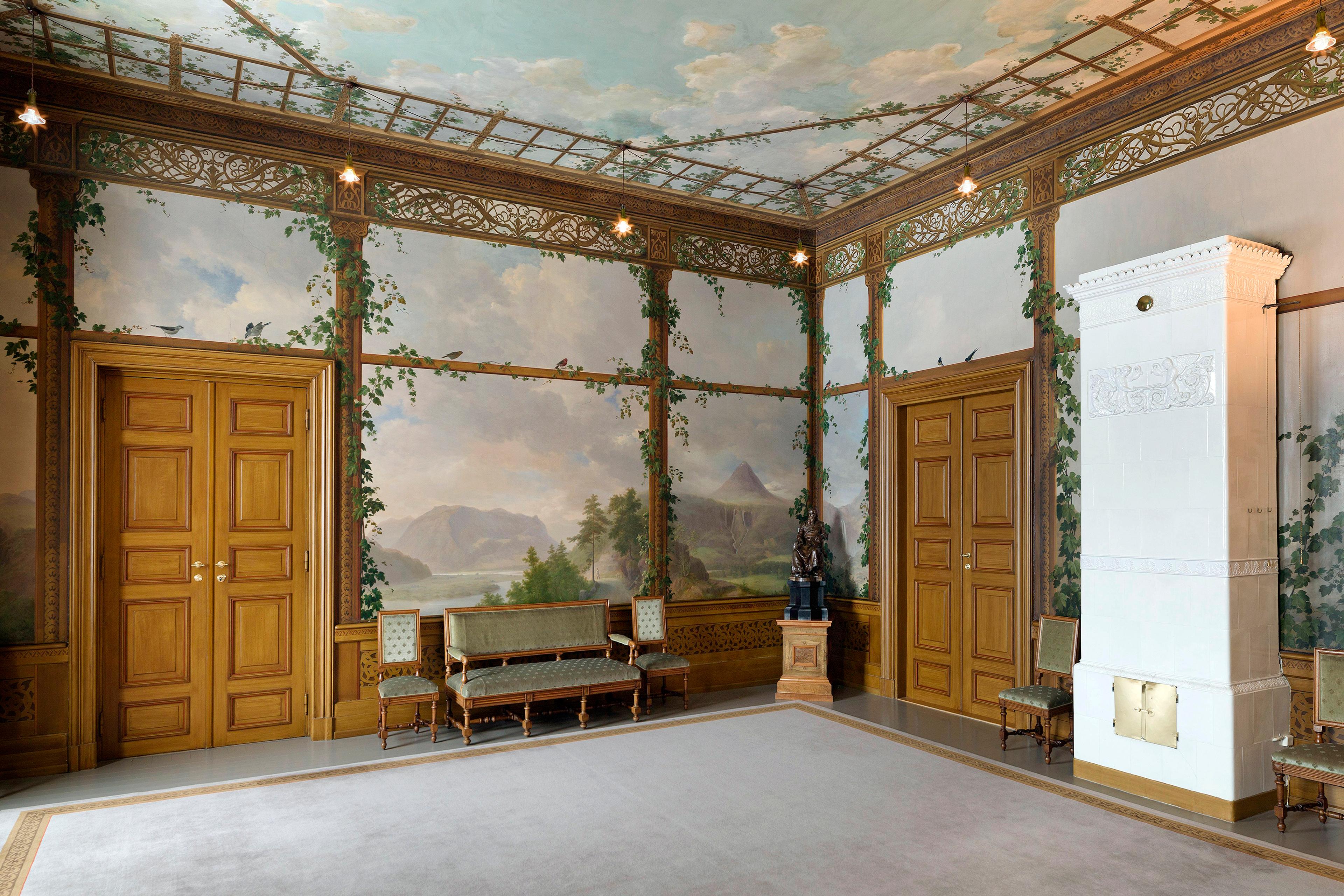 Arbeidene med innredningen startet i 1838, og i denne fasen var arkitektene Heinrich Ernst Schirmer og Johan Henrik Nebelong assistenter for Linstow. Innredningen speiler mangfoldet i stilutviklingen fram mot midten av 1800-tallet. En av de ledende dekorasjonsmalerne på den tiden, Peter Fredrik Wergmann, var ansvarlig for de pompeianske dekorasjonene i Den daglige spisesal og Den store spisesal, mens maleren Johannes Flintoe utførte dekorasjonene i Fugleværelset.