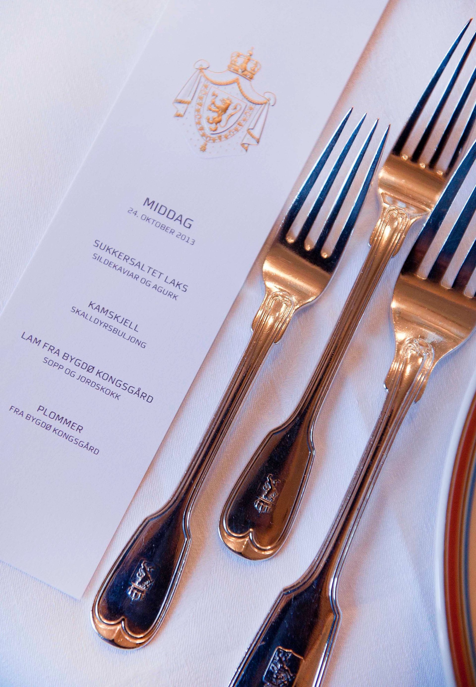 Det serveres vanligvis fire retter basert på norske råvarer. Hele arrangementet varer i omkring tre timer, og når de kongelige forlater salen, er det til tonene fra Valdresmarsjen.