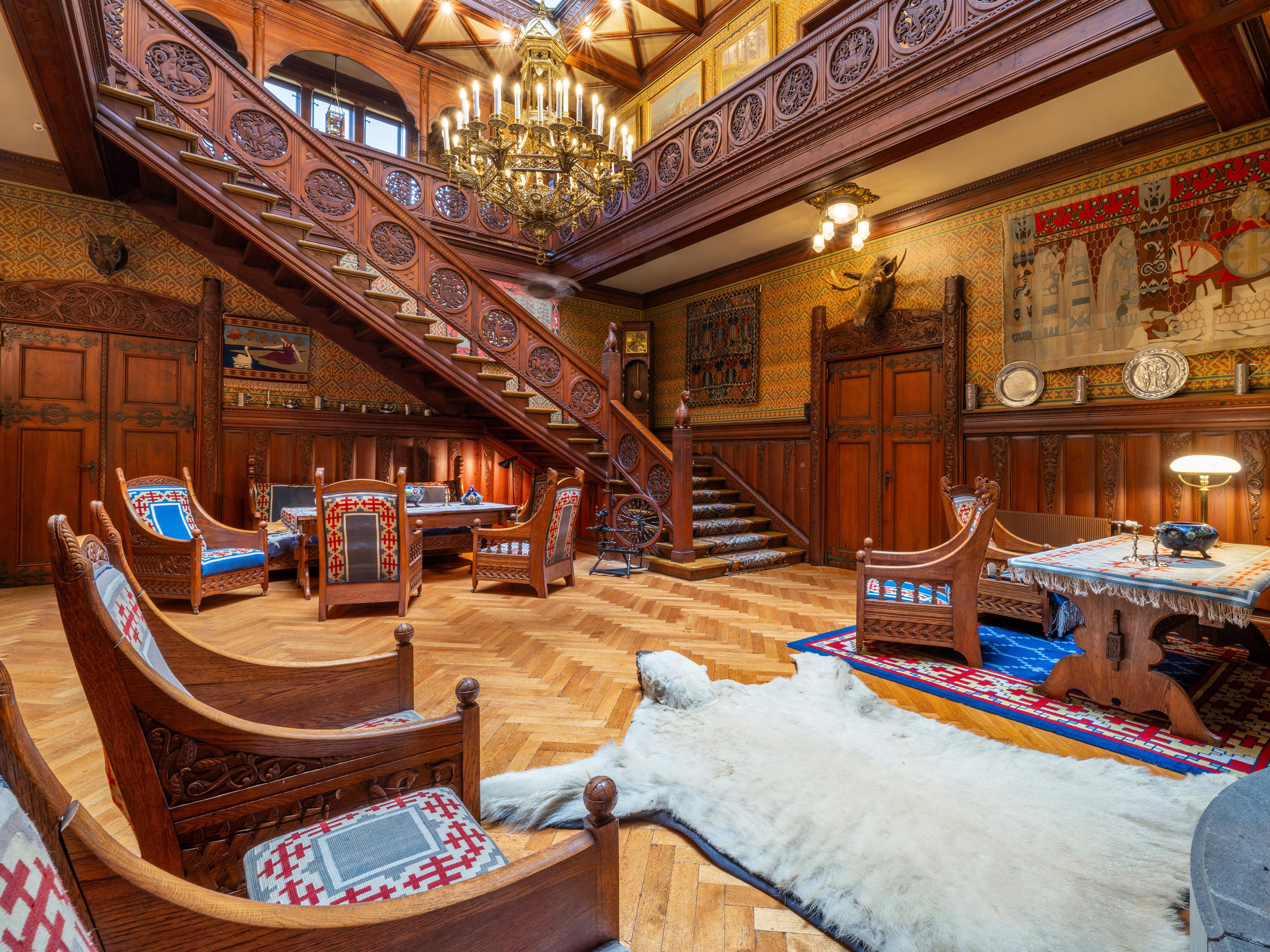 Med sine hvite murer, tårn og spir, kan Gamlehaugen gi assosiasjoner både til franske slott og skotske borger, og omkring det hele ligger en vakker landskapspark i engelsk stil. Men innvendig er det nordisk middelalder som dominerer. Utformet i en tid med sterke nasjonale strømninger, bærer særlig trappehallen preg av romantiske forestillinger om norsk vikingtid.