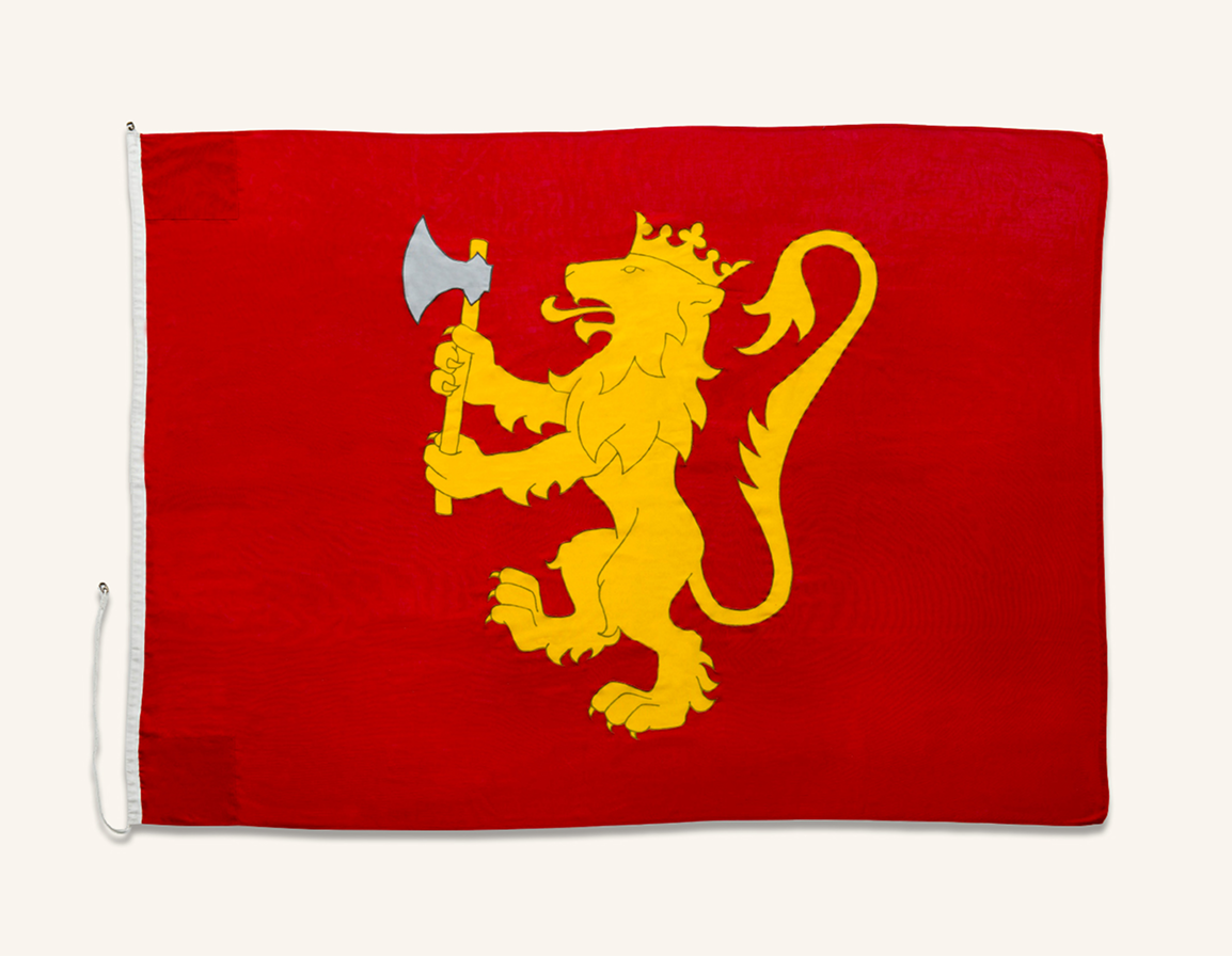 - Kongeflagget: Riksløven i gull, med sølvbladet øks på rød bakgrunn