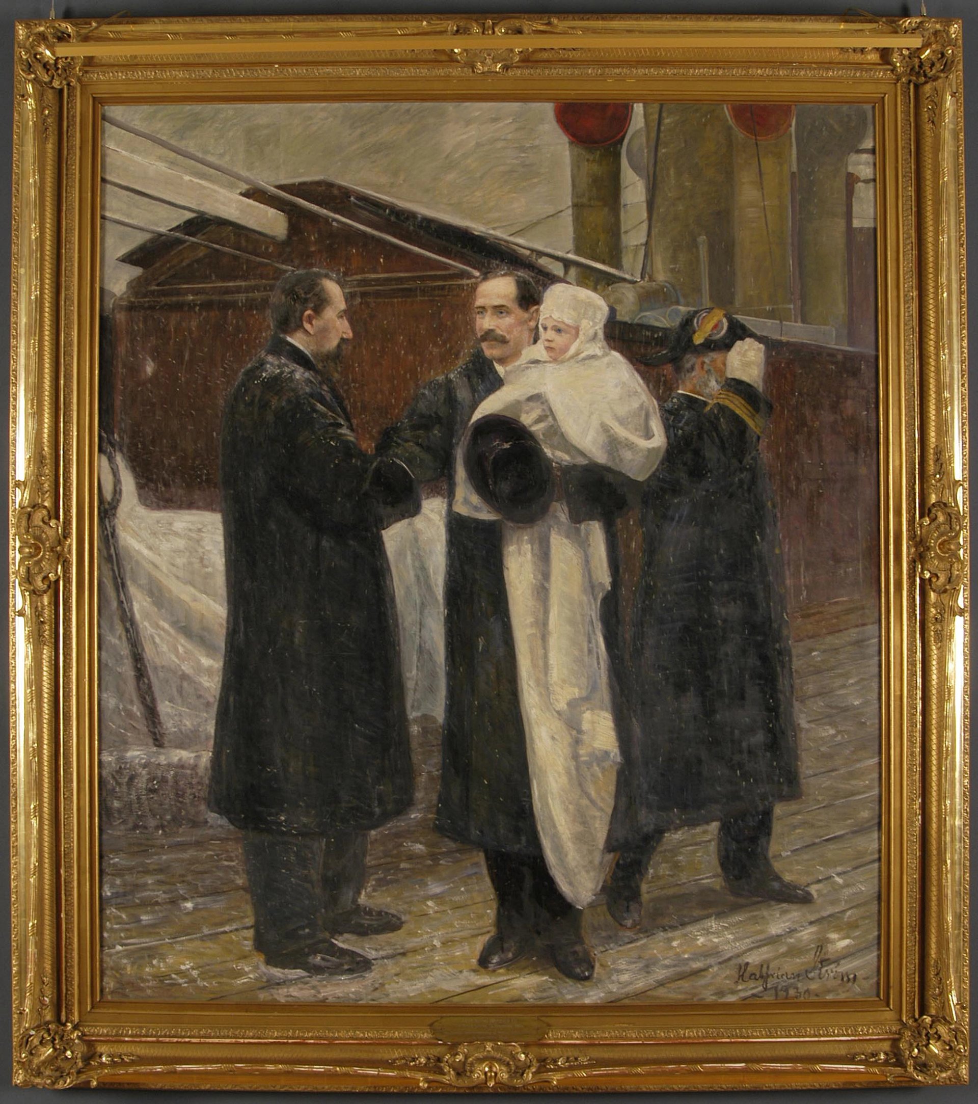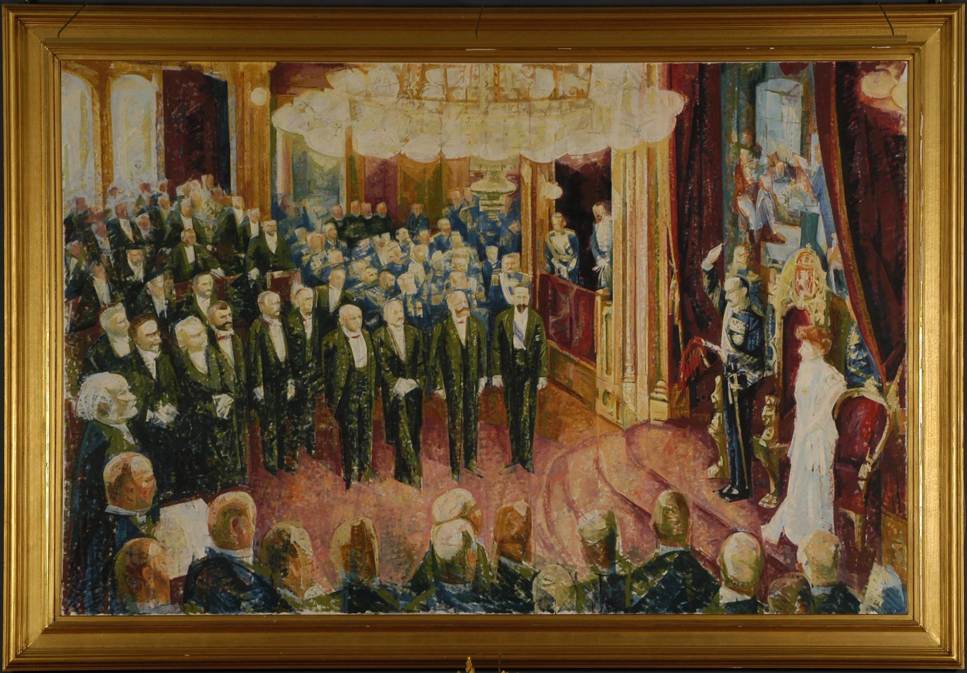Veggene prydes av tre store malerier som gjengir viktige historiske begivenheter i Norge og Kongehusets historie: Kong Haakon som stiger i land som Norges konge 25. november 1905, Kong Haakons edsavleggelse i Stortinget 27. november 1905 og Kongefamiliens hjemkomst etter andre verdenskrig, 7. juni 1945.