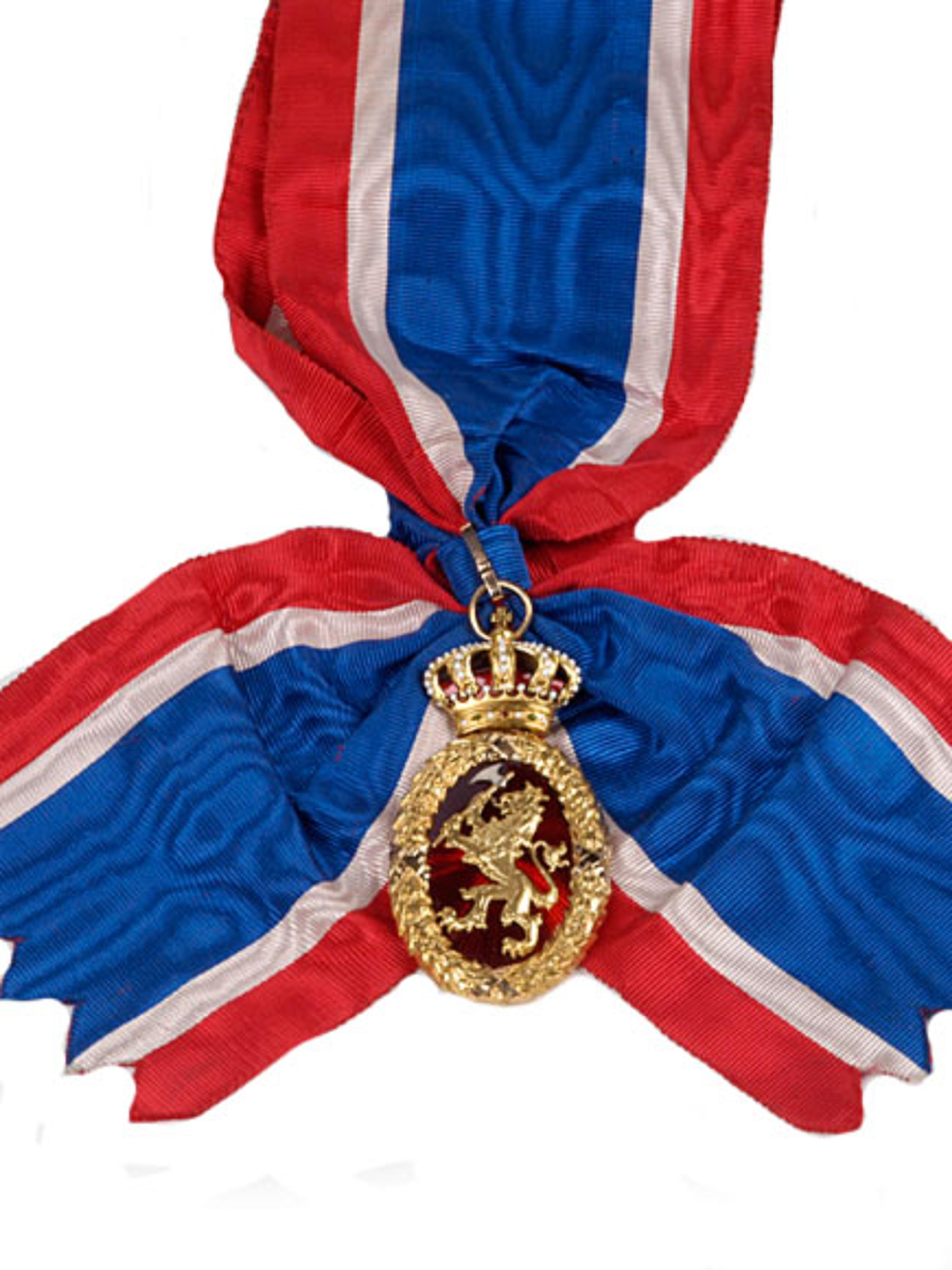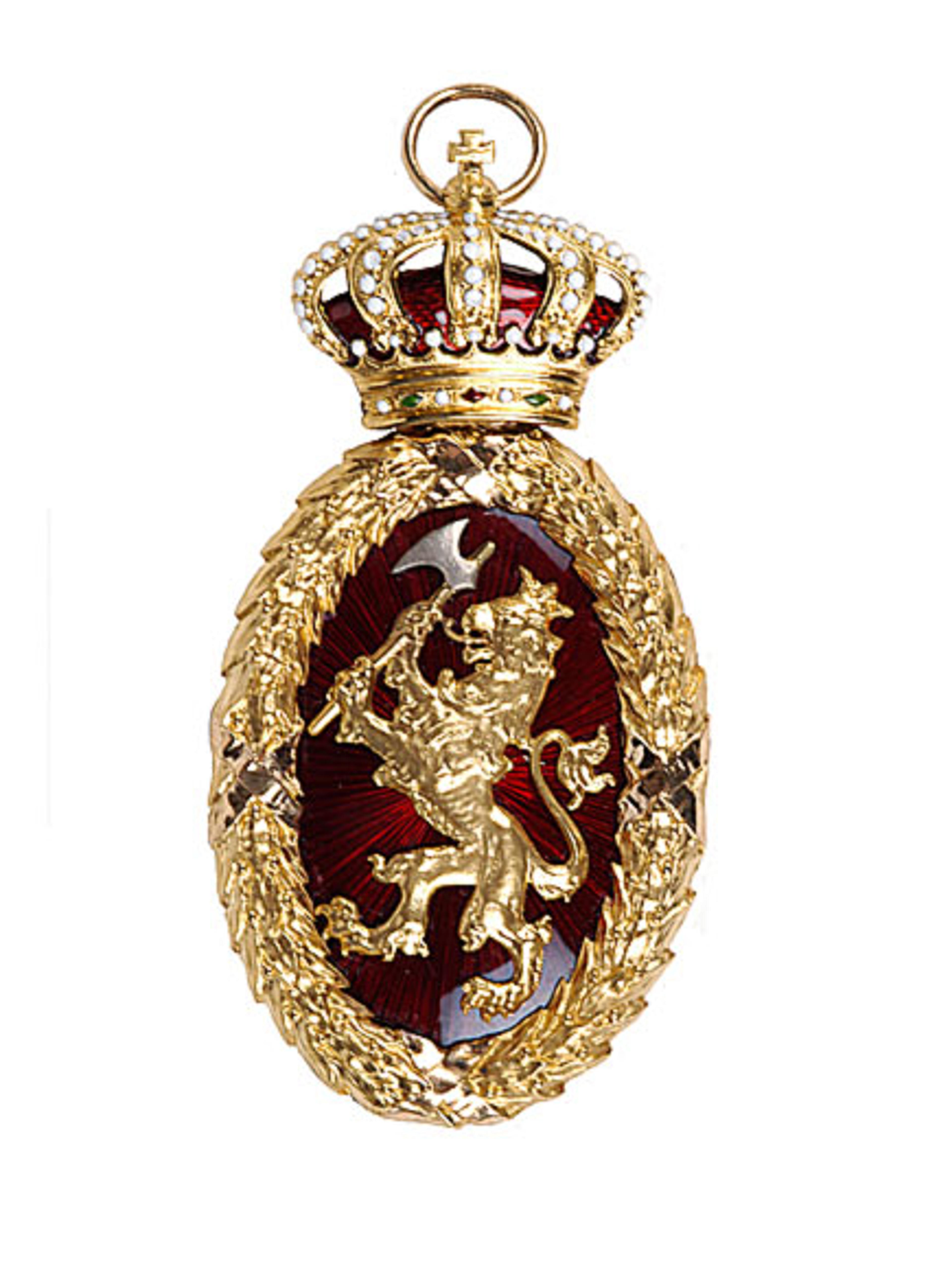 Ordenstegnet besto av en oval rød emaljert medaljong med riksløven i gull innrammet av en gullkrans. Ordensbåndet var blått med røde og hvite kantstriper.
