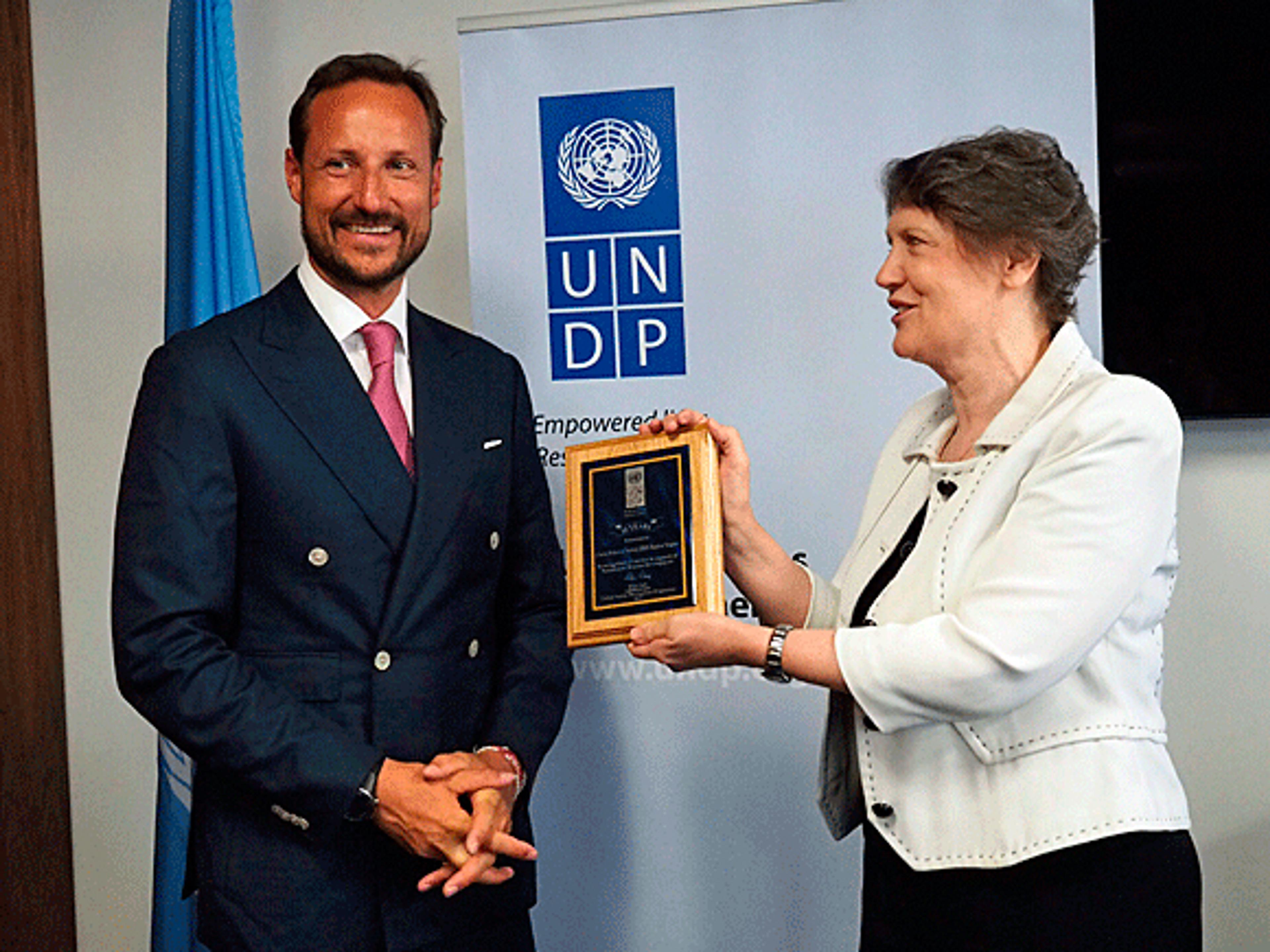 H.K.H. Kronprins Haakon mottok fredag en pris fra FNs utviklingsprogram UNDP for hans over ti år lange engasjement som goodwillambassadør for organisasjonen. Prisen ble overrakt av UNDP-leder Helen Clark.