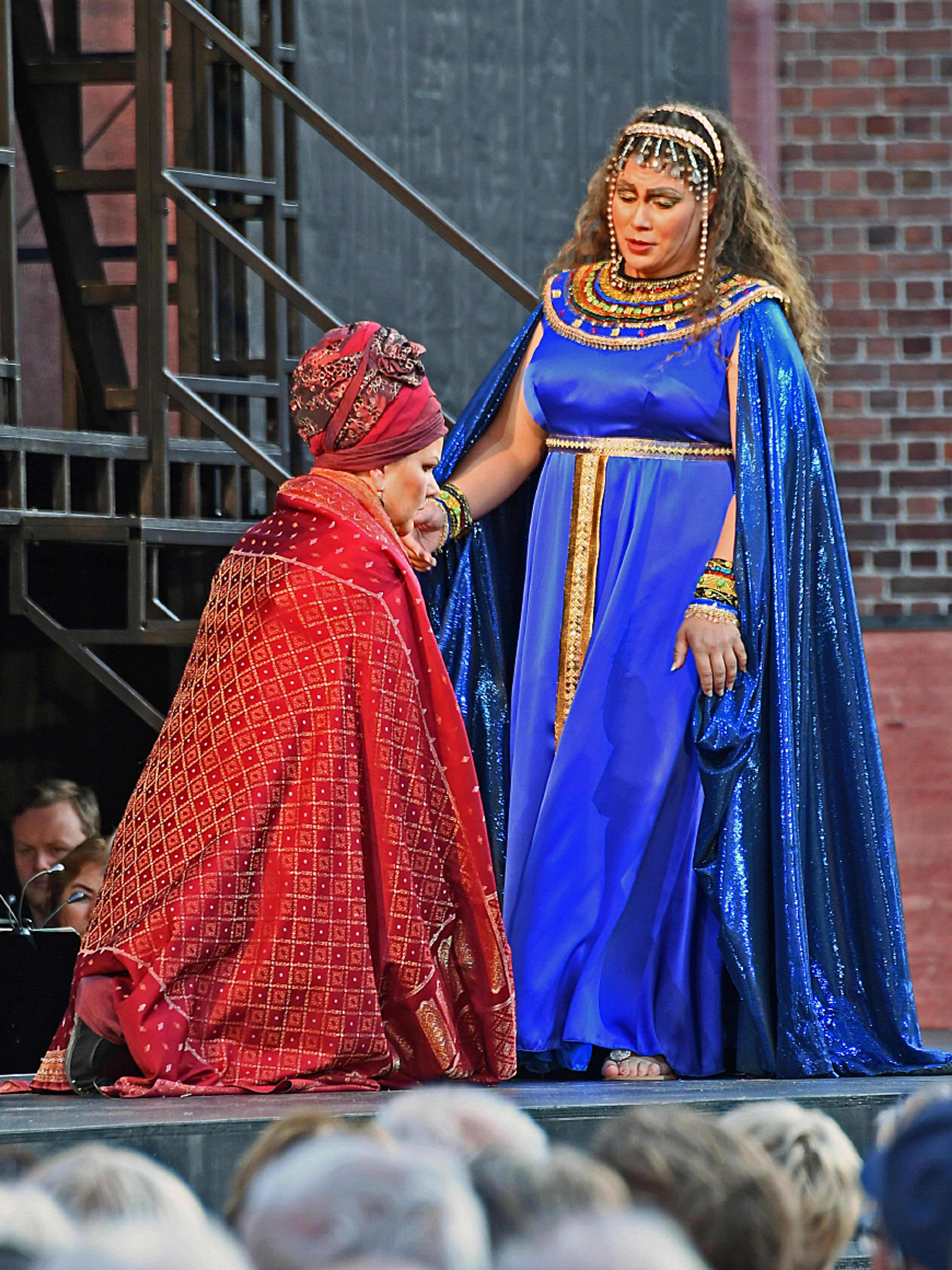 Hennes Majestet Dronning Sonja fikk se Giuseppe Verdis storslagne opera "Aida" i helt spesielle omgivelser på Oscarsborg festning onsdag kveld.