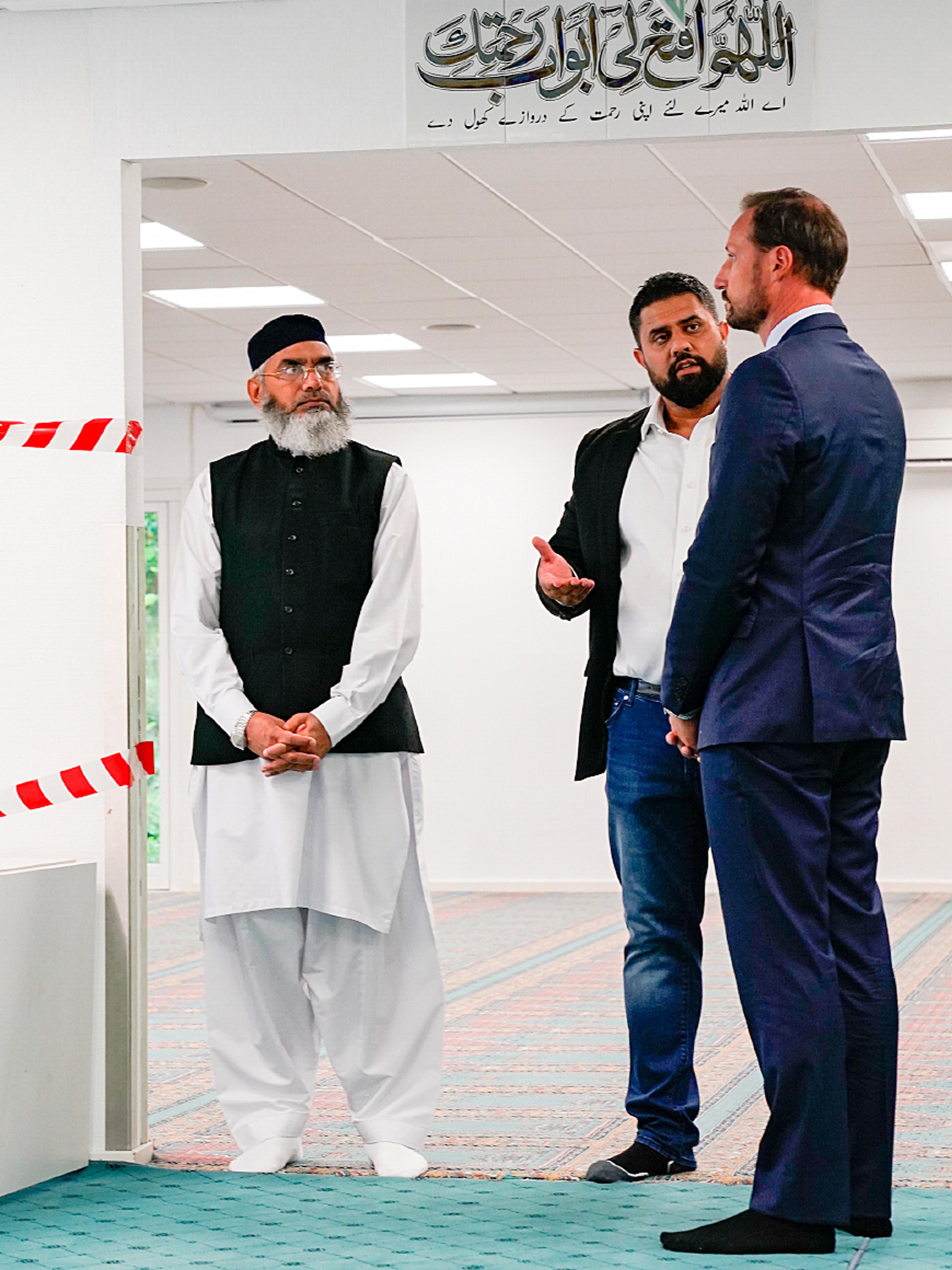 Kronprinsen ble ønsket velkommen av Abdirahman Diriye, leder av Islamsk Råd Norge og Atta Mohammed som er nestleder ved moskéen. Under omvisningen som fulgte fikk Kronprins Haakon se stedet der terrorangrepet 10. august fant sted og en innføring i hendelsesforløpet.