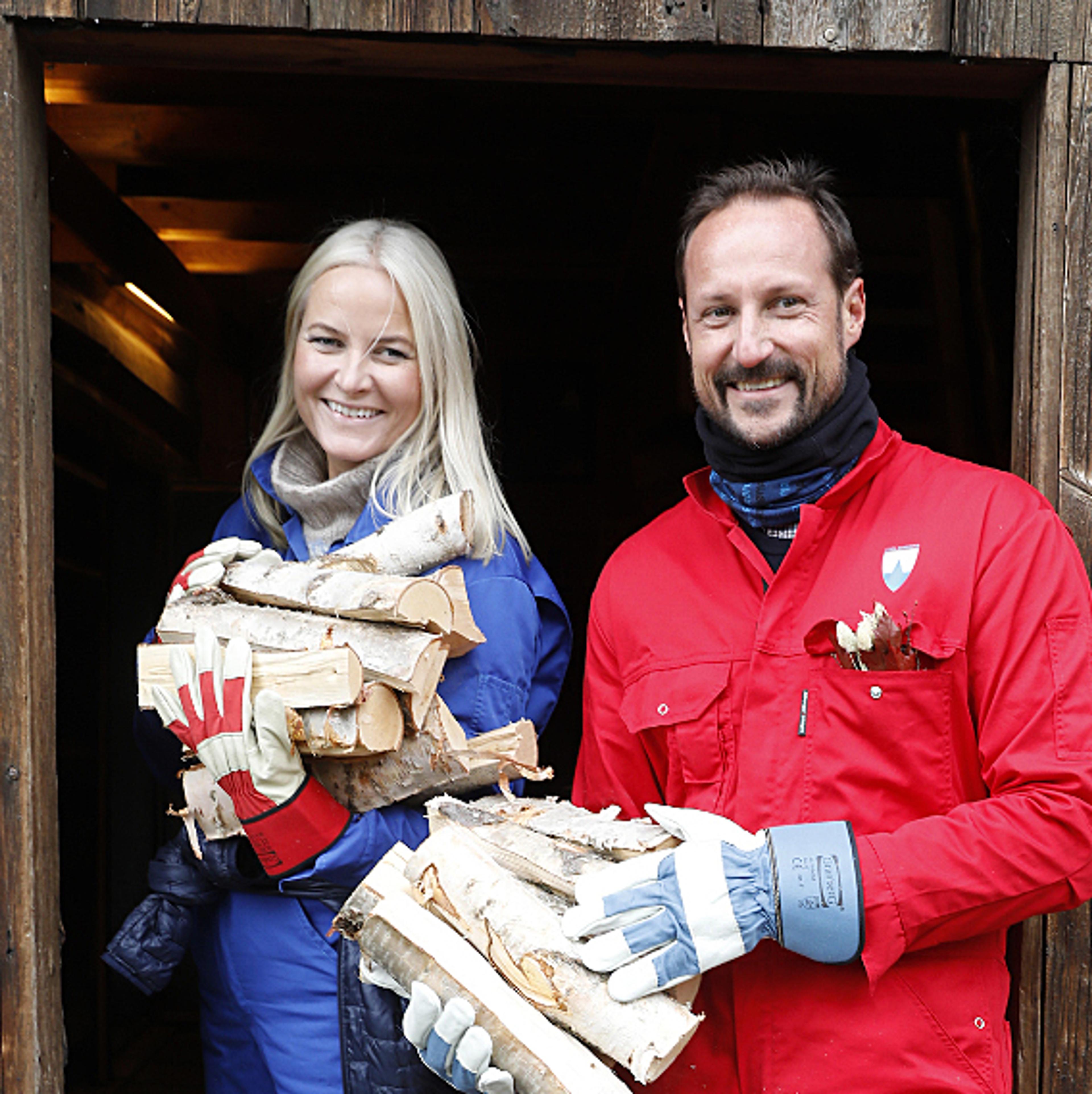 Kronprinsparet bidrog med vedstabling under dugnaden på Lesja bygdemuseum. Foto: Stian Lysberg Solum / NTB scanpix