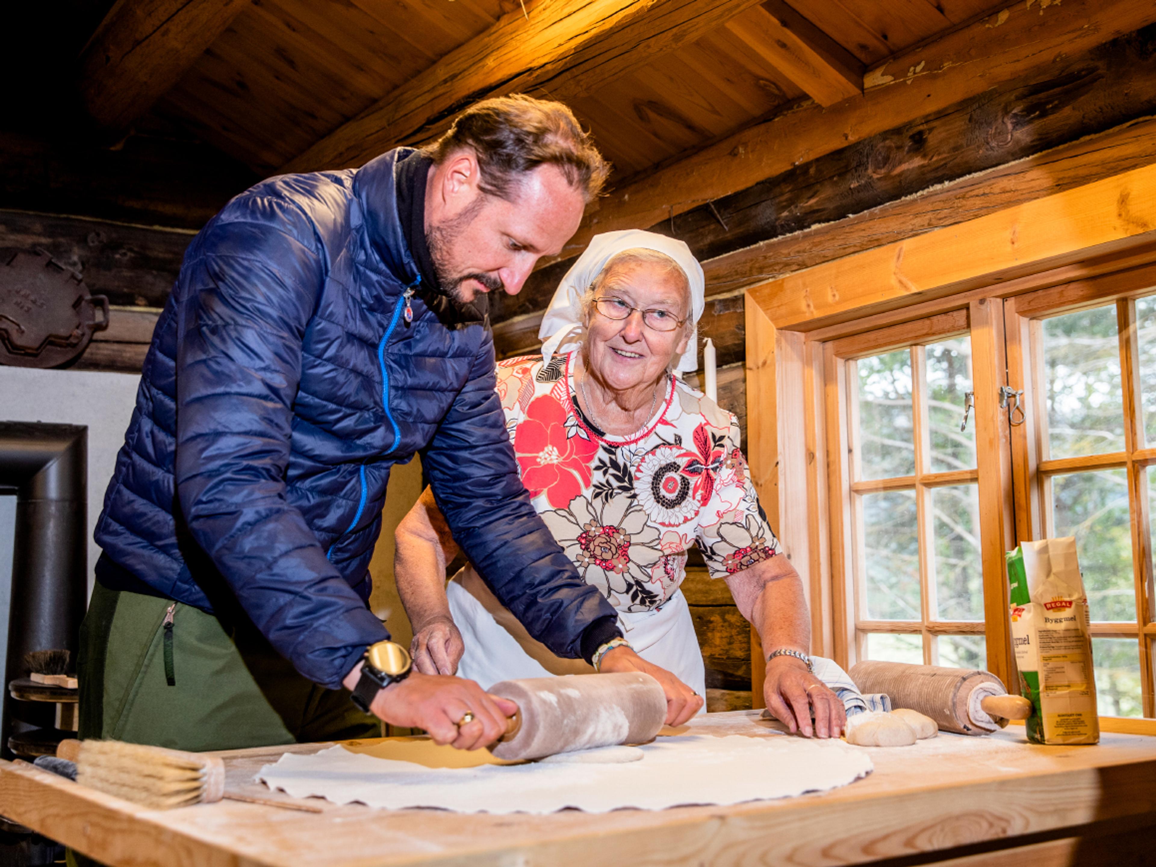 Marie Jøndal lærer Kronprinsen å bake lefse. Foto: Guri Varpe, Det kongelege hoffet