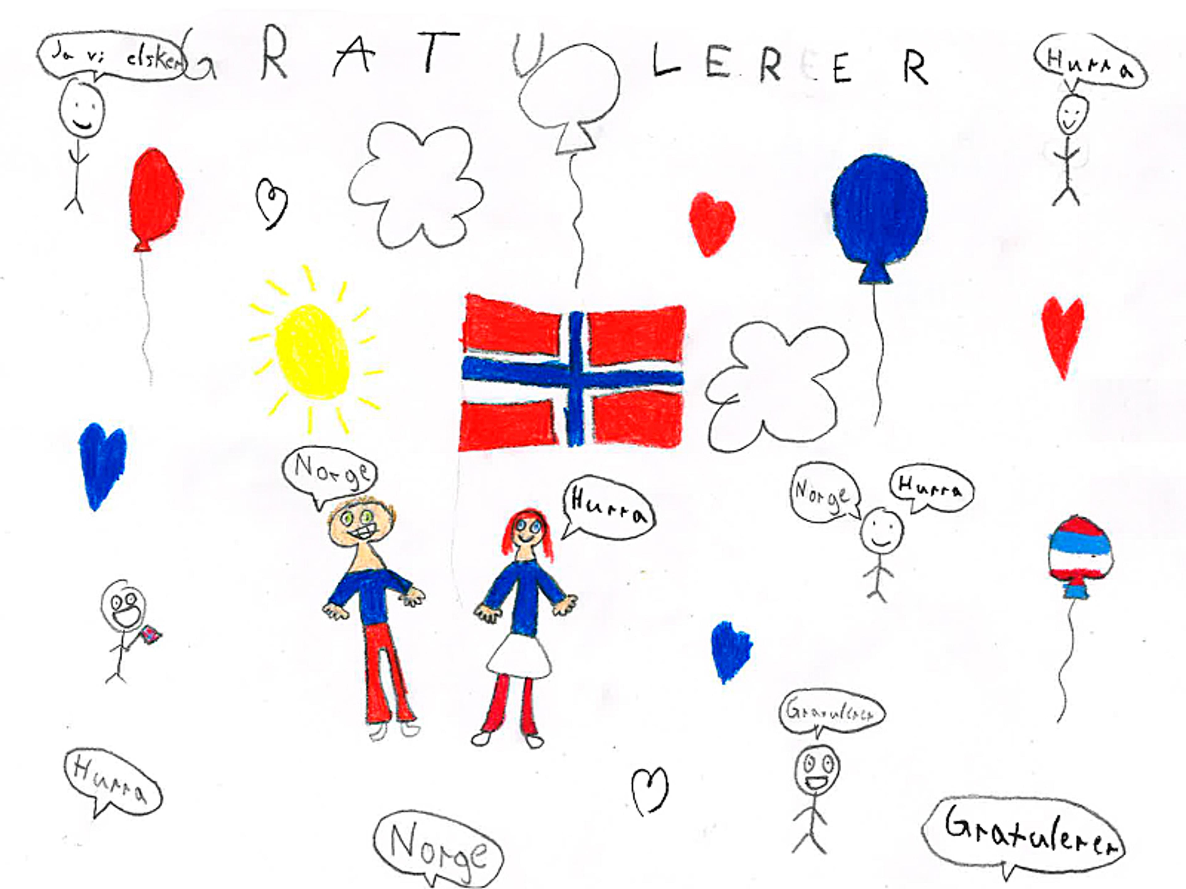 De flotte tegningene viser mye fint barna forbinder med 17. mai. Flere finnes i karusellen til høyre (eller under, om du bruker mobil) og på Kongehusets barnesider.