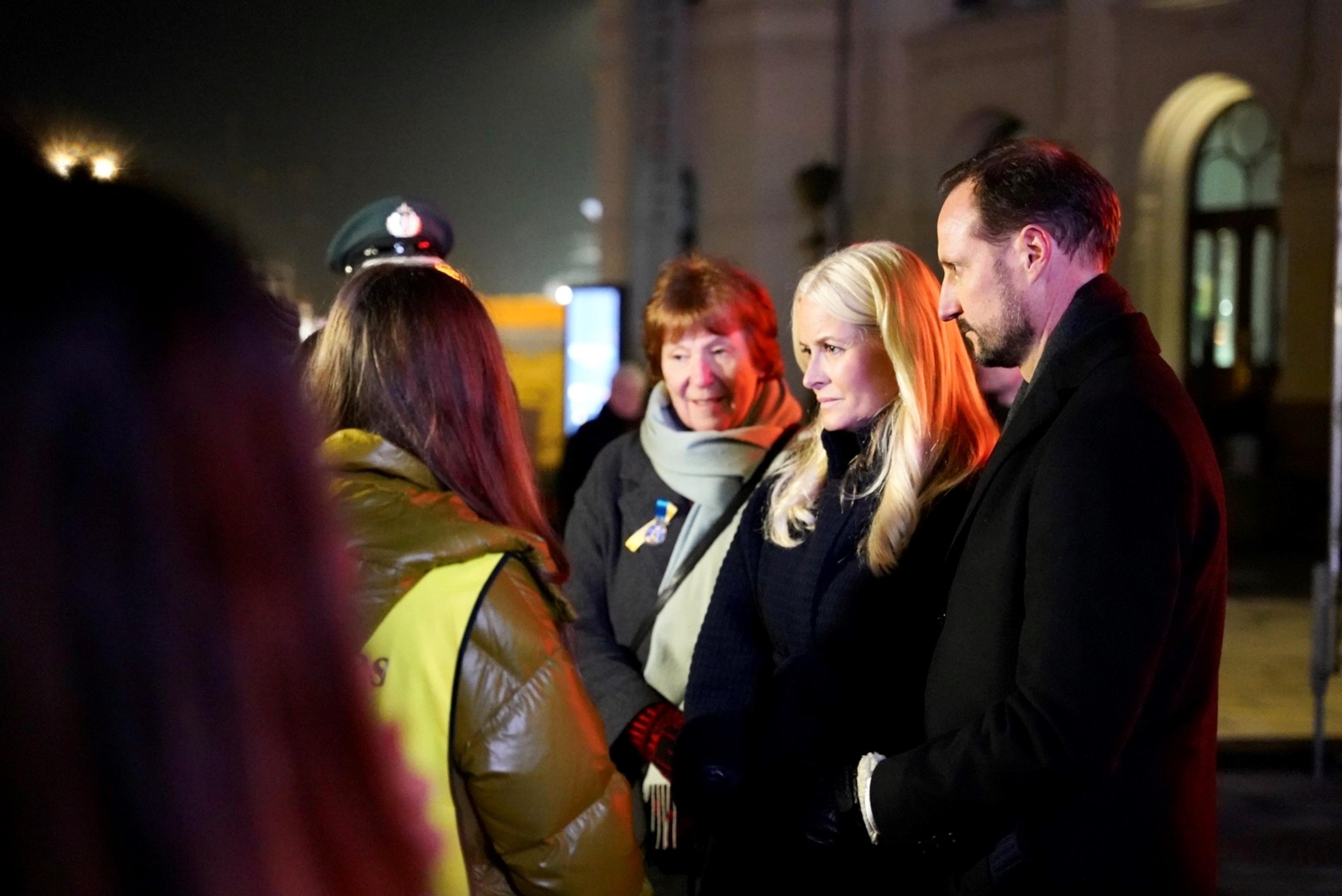 Deres Kongelige Høyheter Kronprinsen og Kronprinsessen var til stede under en markering til støtte for ofrene for krigen i Ukraina utenfor Nobels fredssenter i Oslo i kveld.