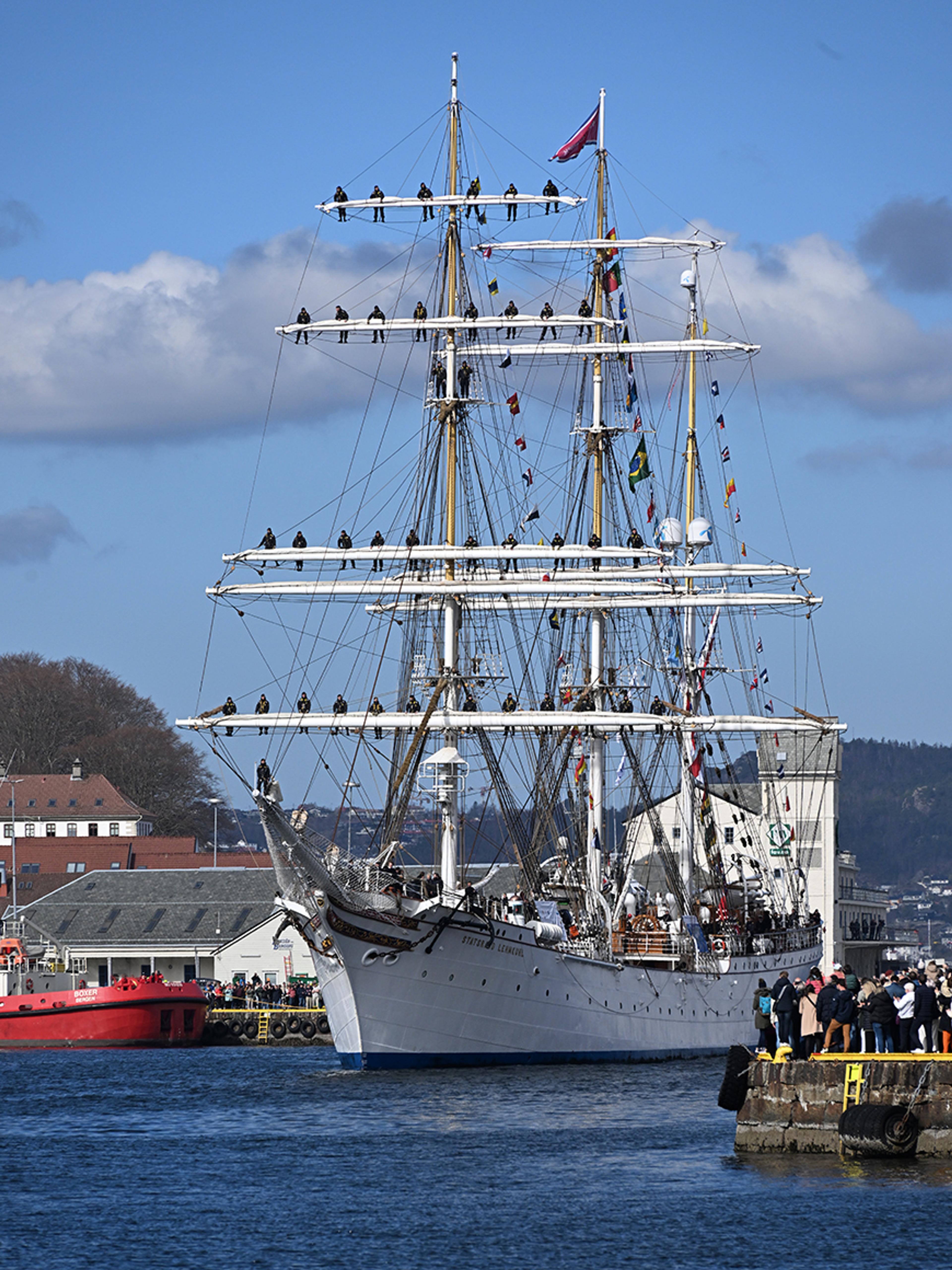Hans Majestet Kongen var til stades på Bryggen i Bergen da fullriggaren Statsraad Lehmkuhl la til kai i dag. Skuta har tilbakelagt meir enn 60 000 nautiske mil på seglasen «One Ocean Expedition».