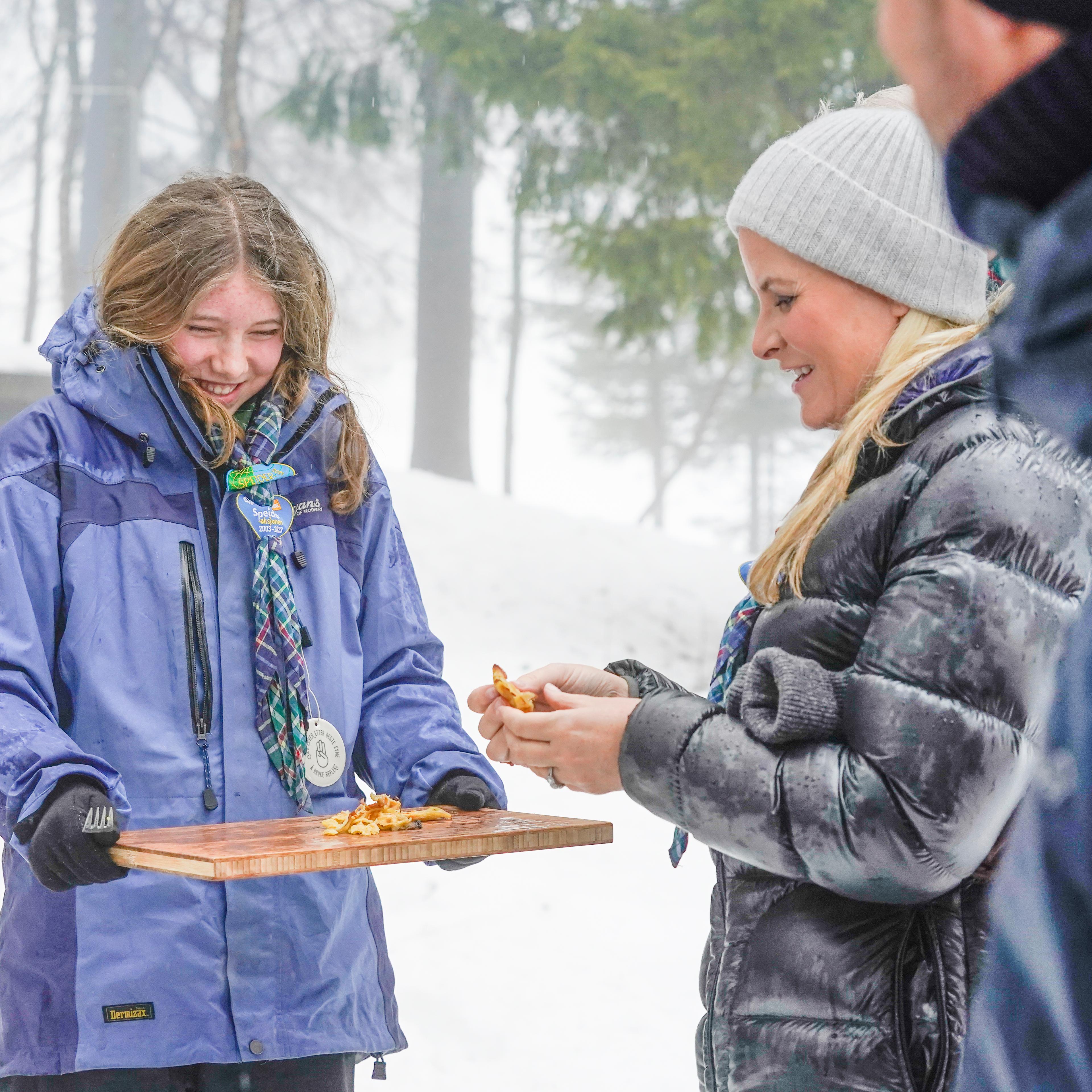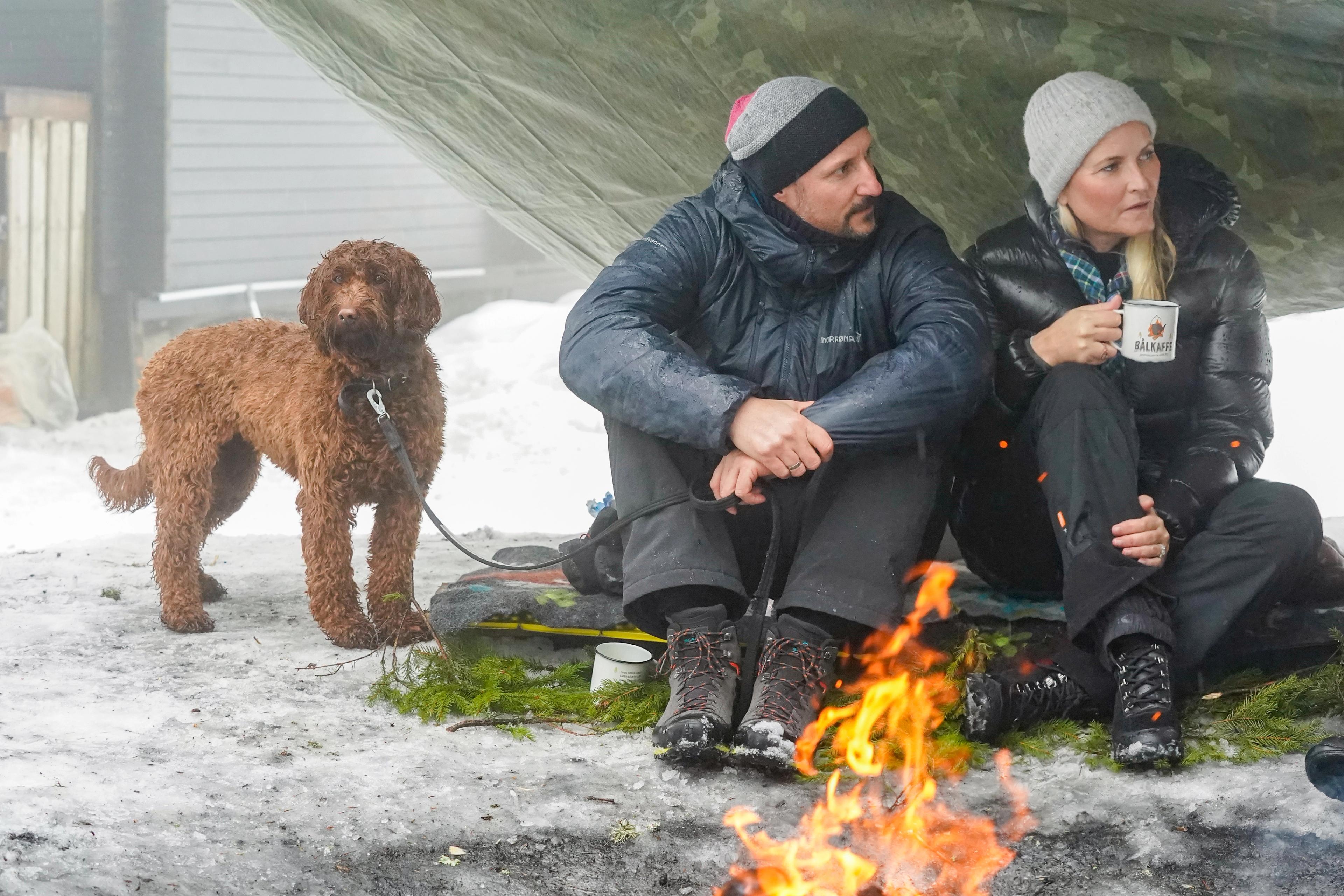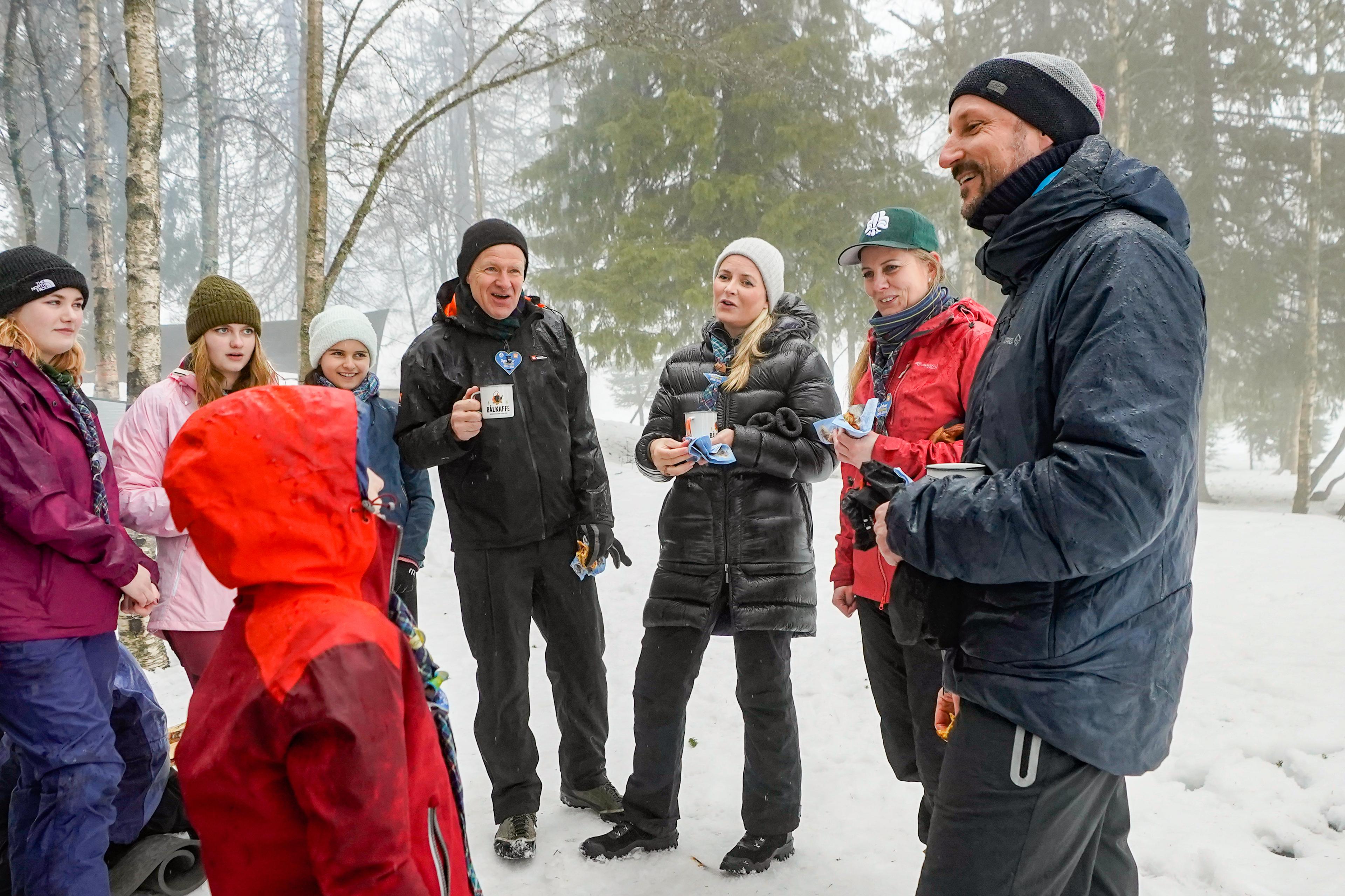 Rundt et leirbål ved Øvresetertjern i Nordmarka møtte Kronprins Haakon og Kronprinsesse Mette-Marit generalsekretær i Norges speiderforbund Stine Schultz Heireng og generalsekretær i Flyktninghjelpen Jan Egeland og flere av de unge speiderne som tar del i årets aksjon.