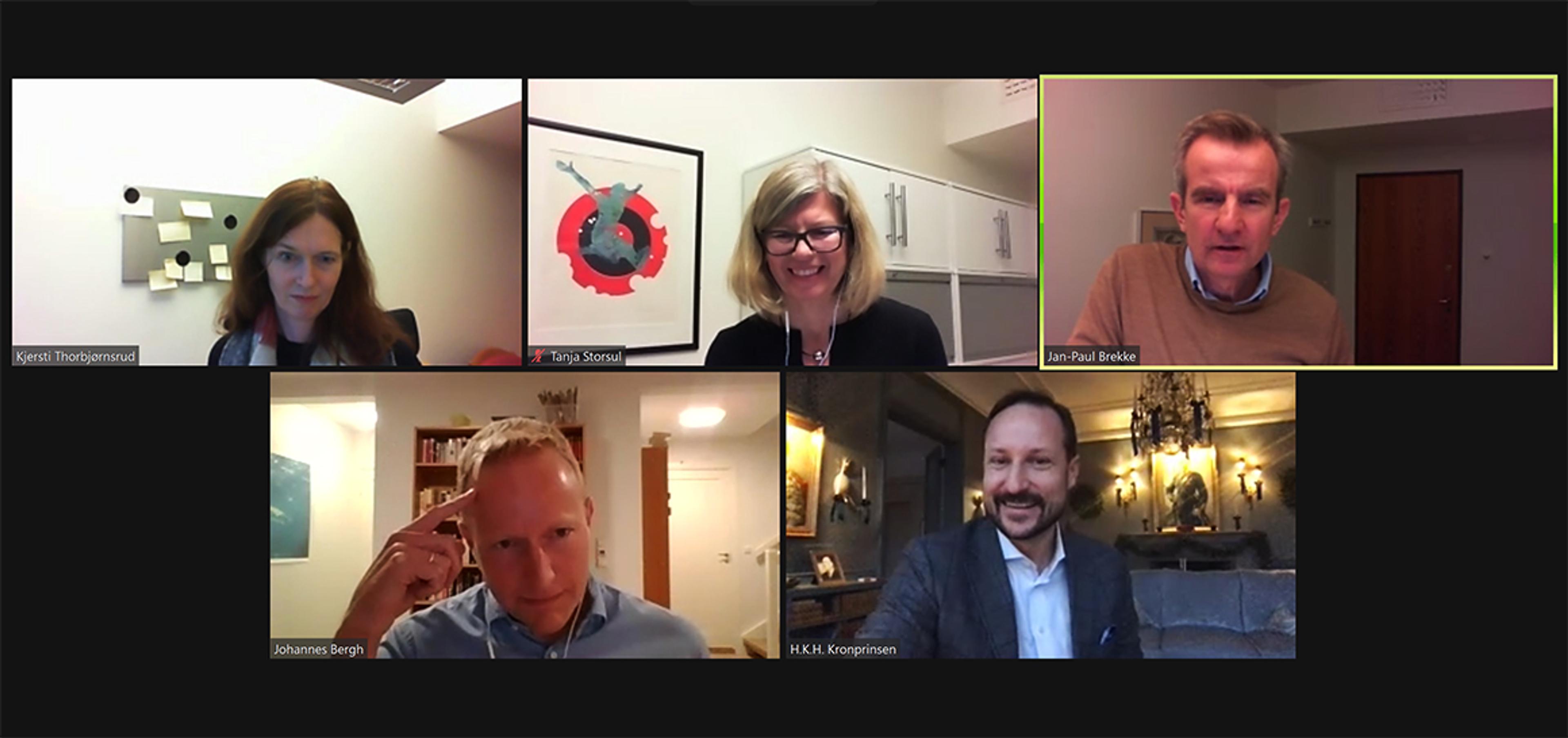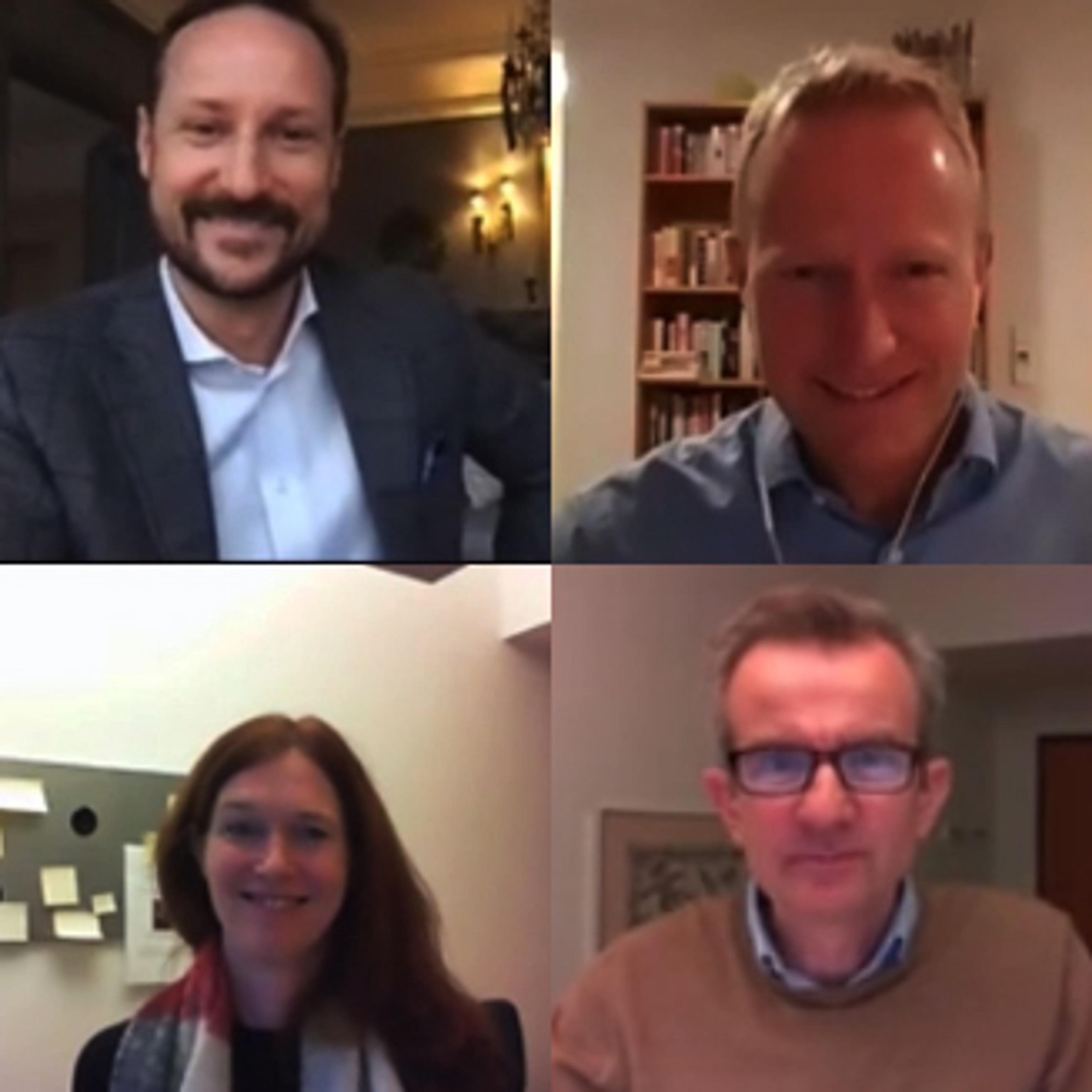Møtet foregikk digitalt onsdag formiddag. Kronprins Haakon satt på Skaugum, mens de tre forskerne deltok fra sine hjemmekontor. Direktør Tanja Storsul var også med i møtet og innledet samtalen.