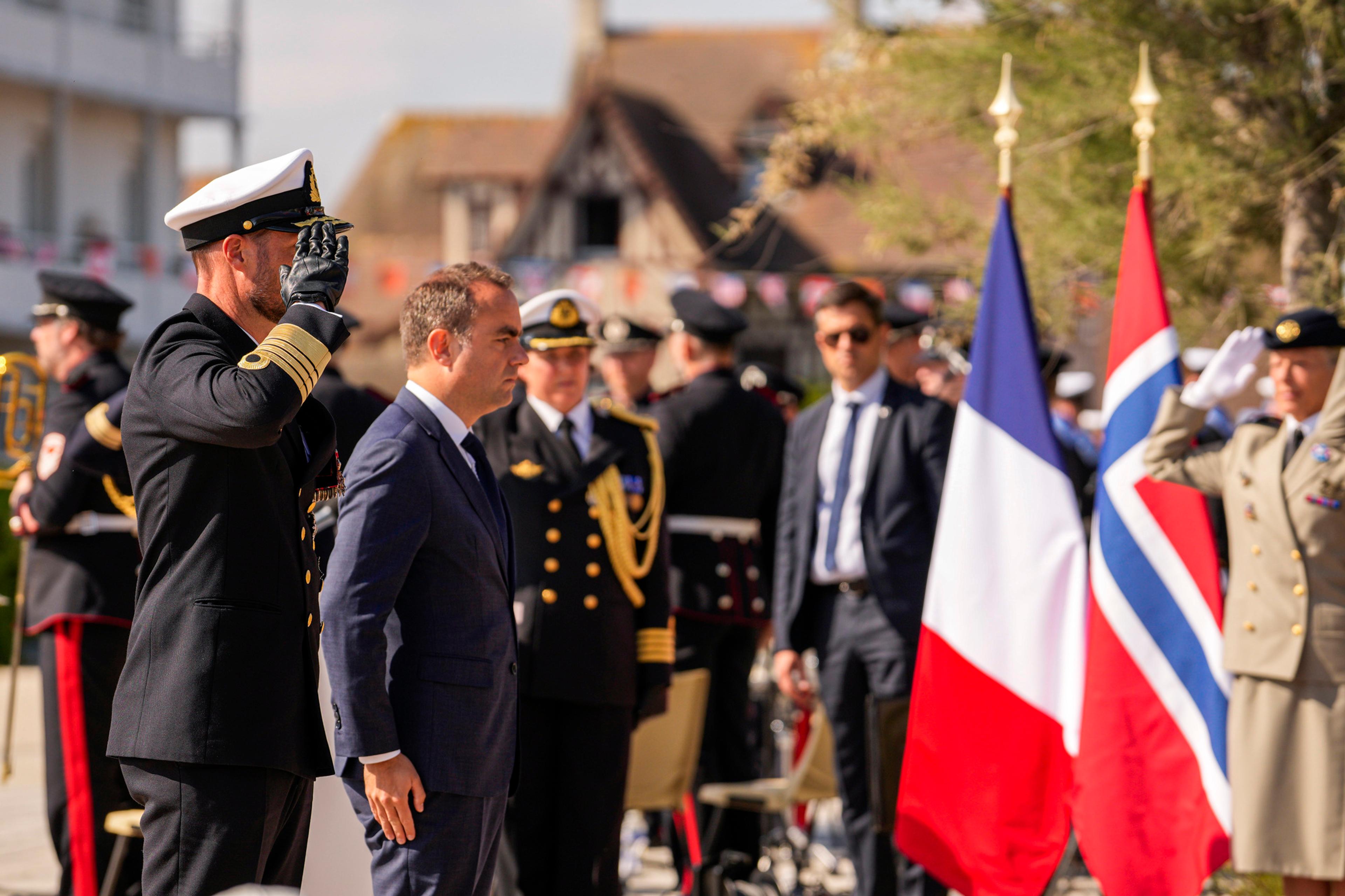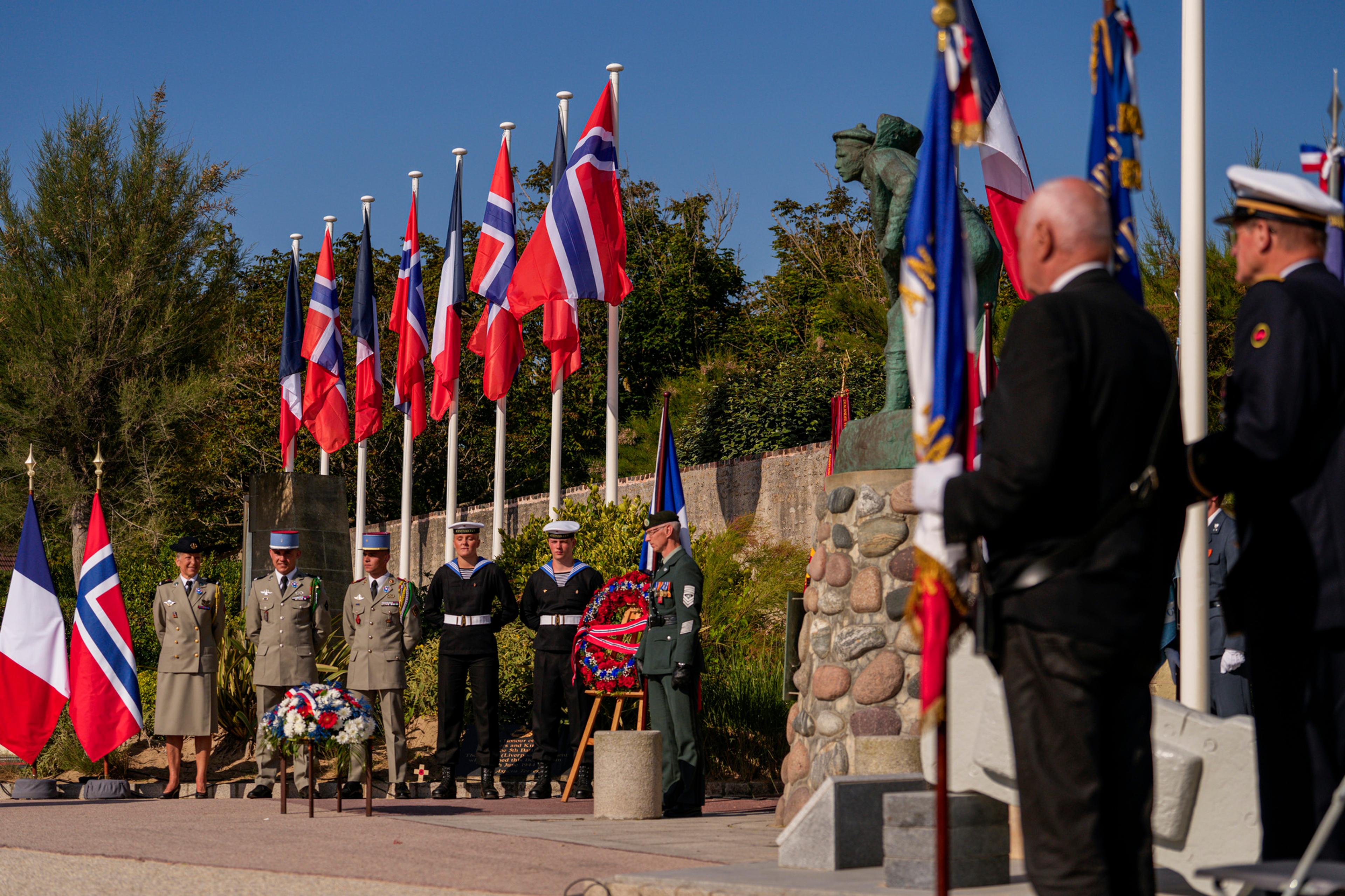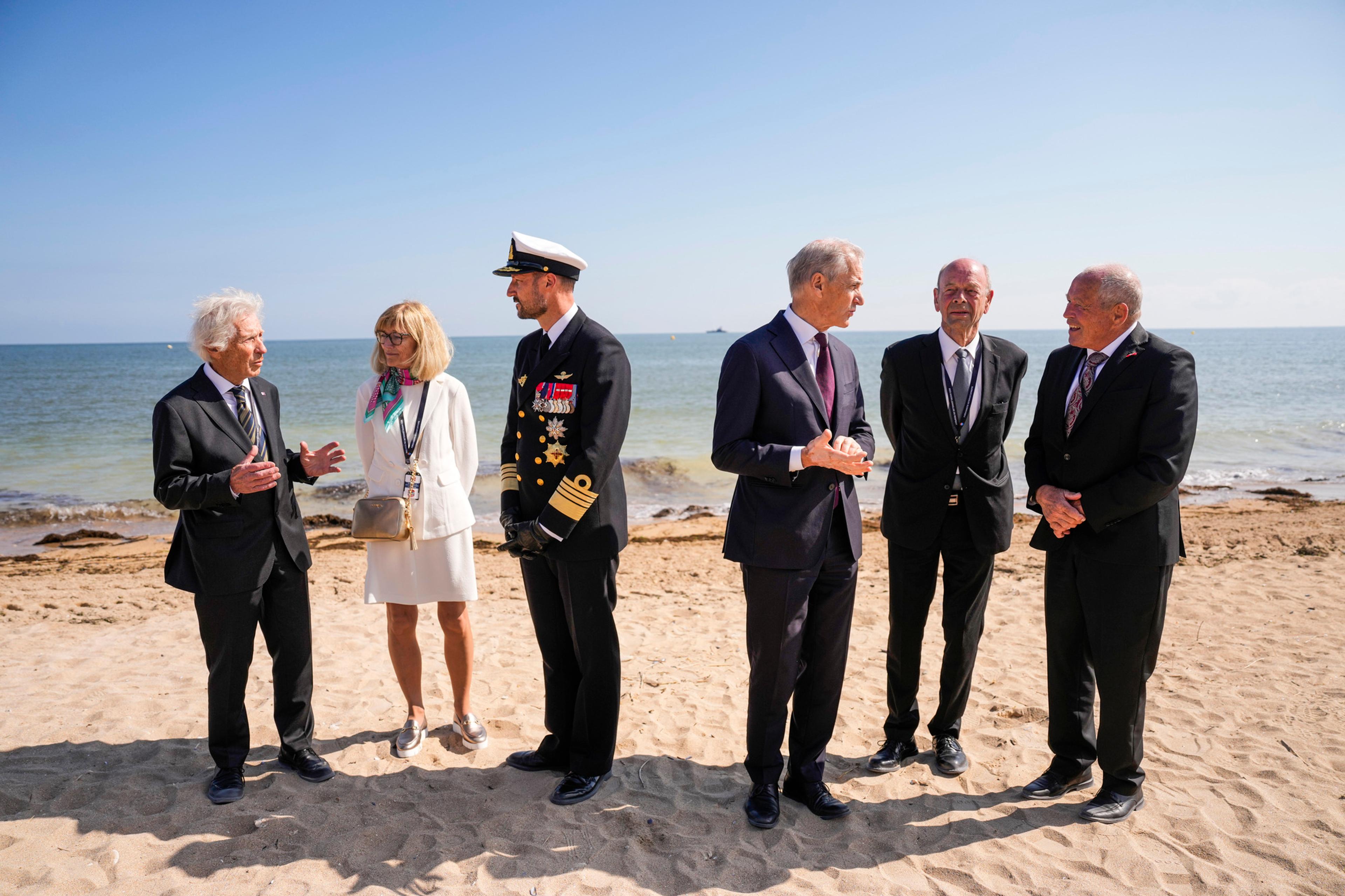 Sammen med blant andre statsminister Jonas Gahr Støre og forsvarsminister Bjørn Arild Gram startet Kronprinsen dagen med en markering ved Norges nasjonale monument i Hermanville-sur-Mer i Normandie.