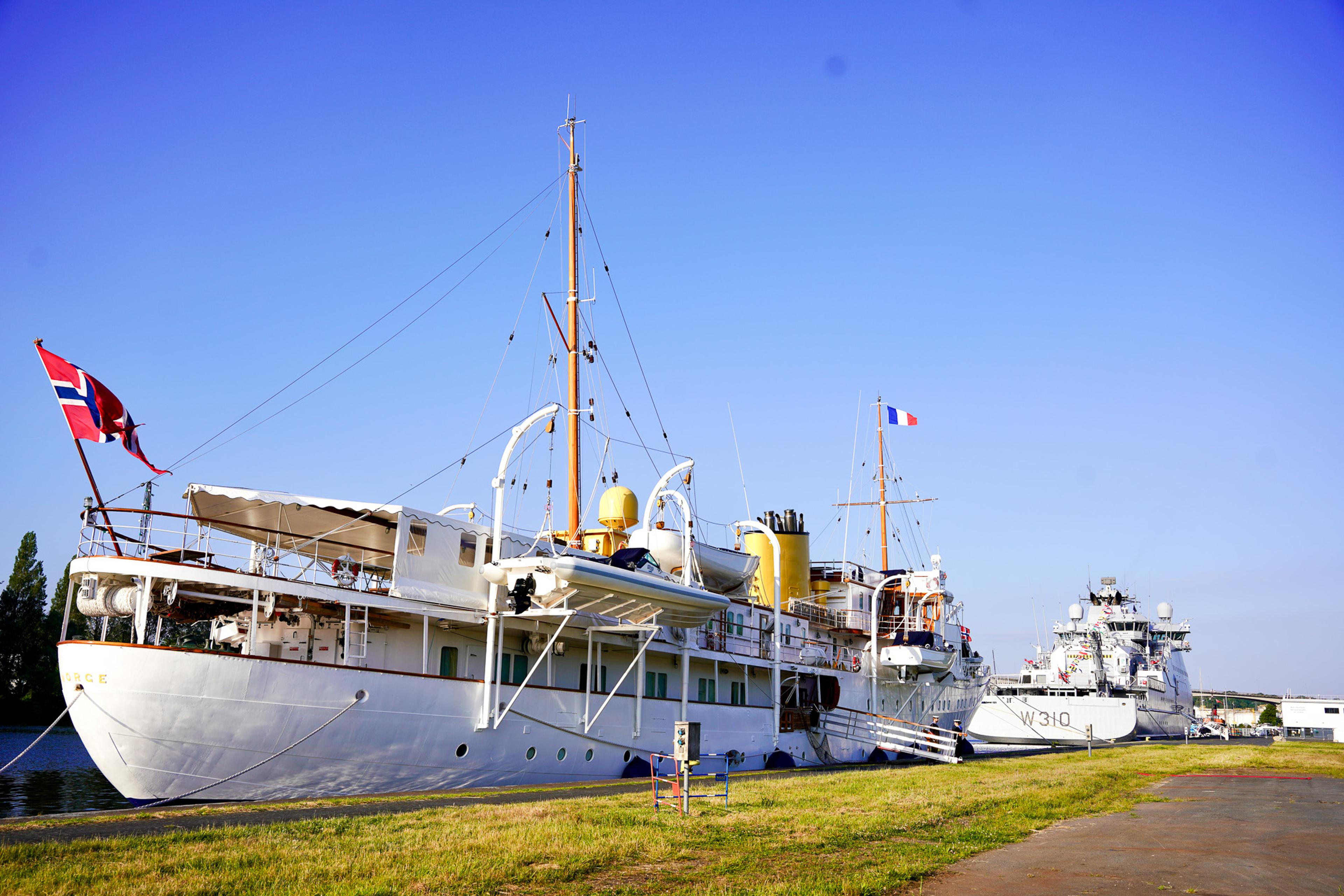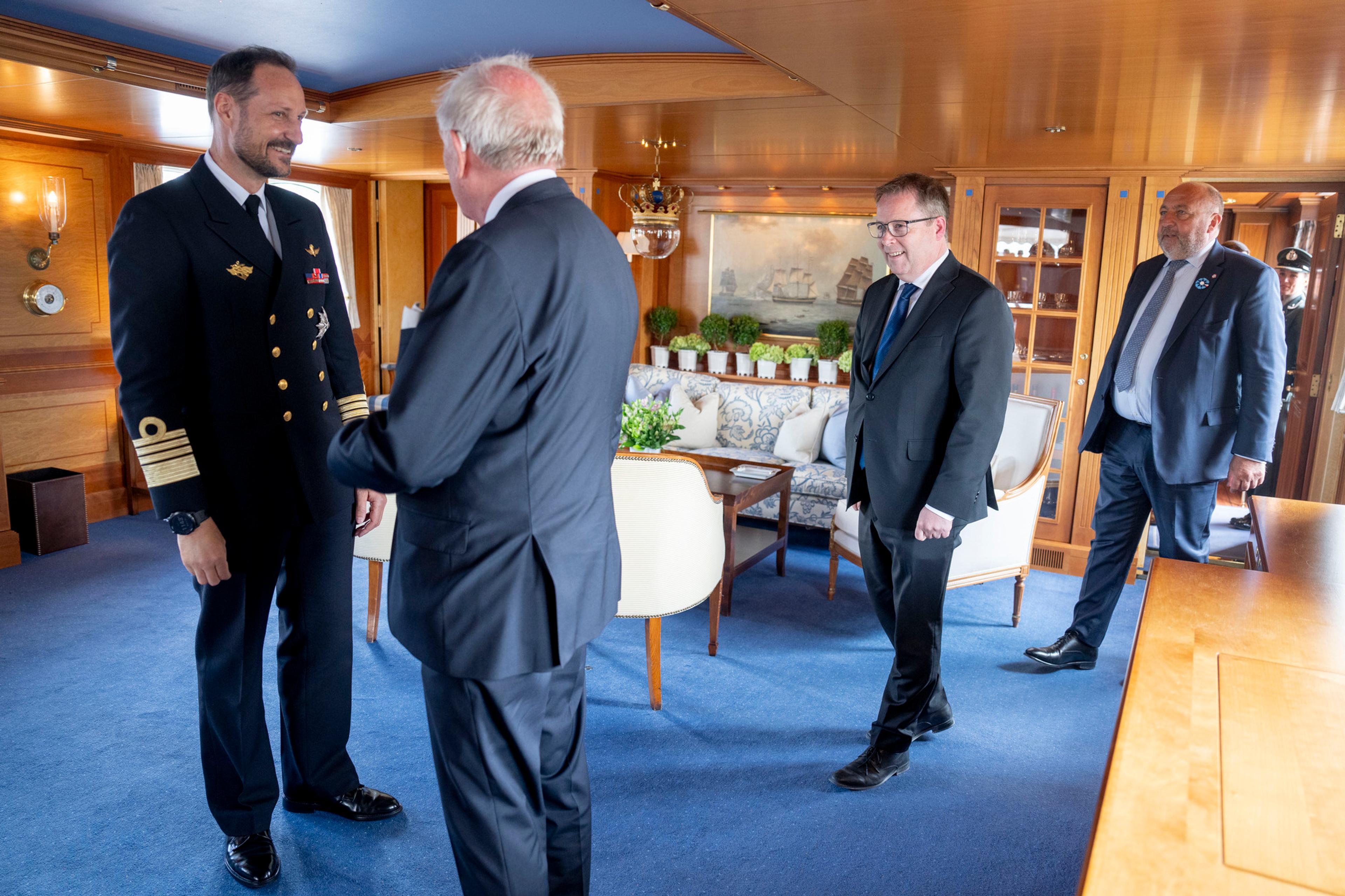 Etter den nasjonale seremonien i Hermanville-Sur-Mer inviterte Kronprinsen til mottakelse på Kongeskipet Norge, som ligger til kai ved havnen i byen Caen i Normandie. På kaien spilte Forsvarets stabmusikkorps da gjestene ankom mottakelsen.