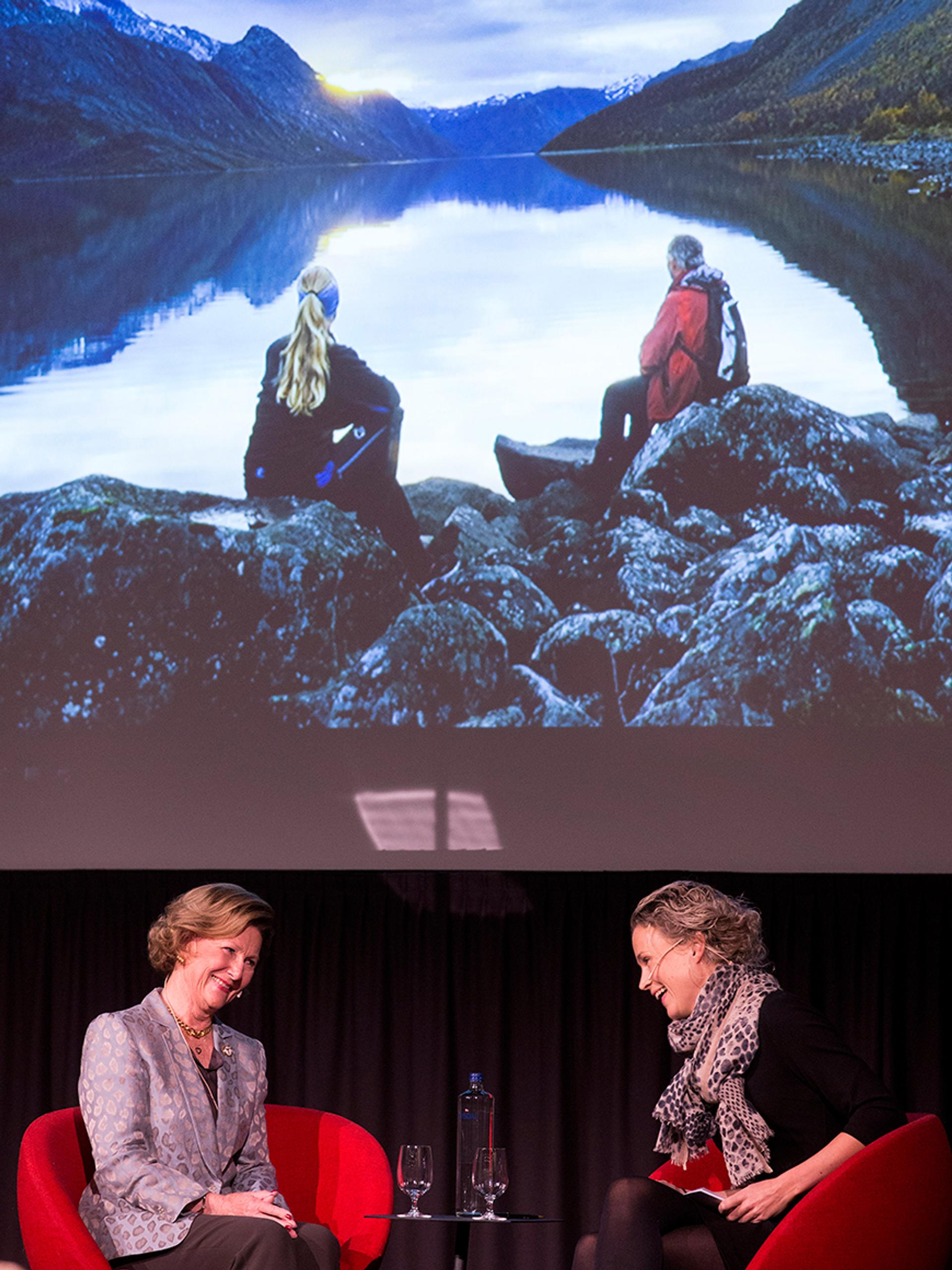 Dronning Sonja har vært æresmedlem av Den Norske Turistforening siden 2007 og hennes kjærlighet til friluftsliv og norsk natur er velkjent. Under åpningen av konferansen i dag, snakket Dronningen med konferansier Ingunn Solheim om tur og natur og hva det betyr. H.K.H. Kronprinsessen var også til stede ved åpningen i dag.