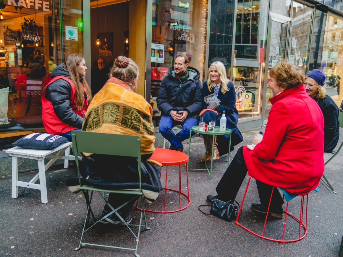 I følge med biskop Kari Veiteberg og ordfører Marianne Borgen tok Deres Kongelige Høyheter Kronprinsen og Kronprinsessen turen til Akersgata der =Kaffe holder til.