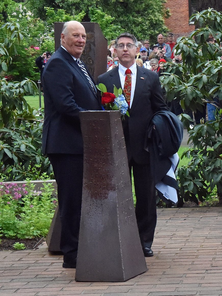 Det er ikke første gang PLU har norske kongelige på besøk. Kong Harald var her også for 20 år siden i følge med Dronningen, og Kong Olav besøkte universitetet i 1975. Det ble reist en runestein på campus til minne om Kong Olavs besøk, og i går kunne universitetets president, Thomas Krise, ledsage Kong Harald tilbake til steinen, som nå var inngravert med nok et besøk.