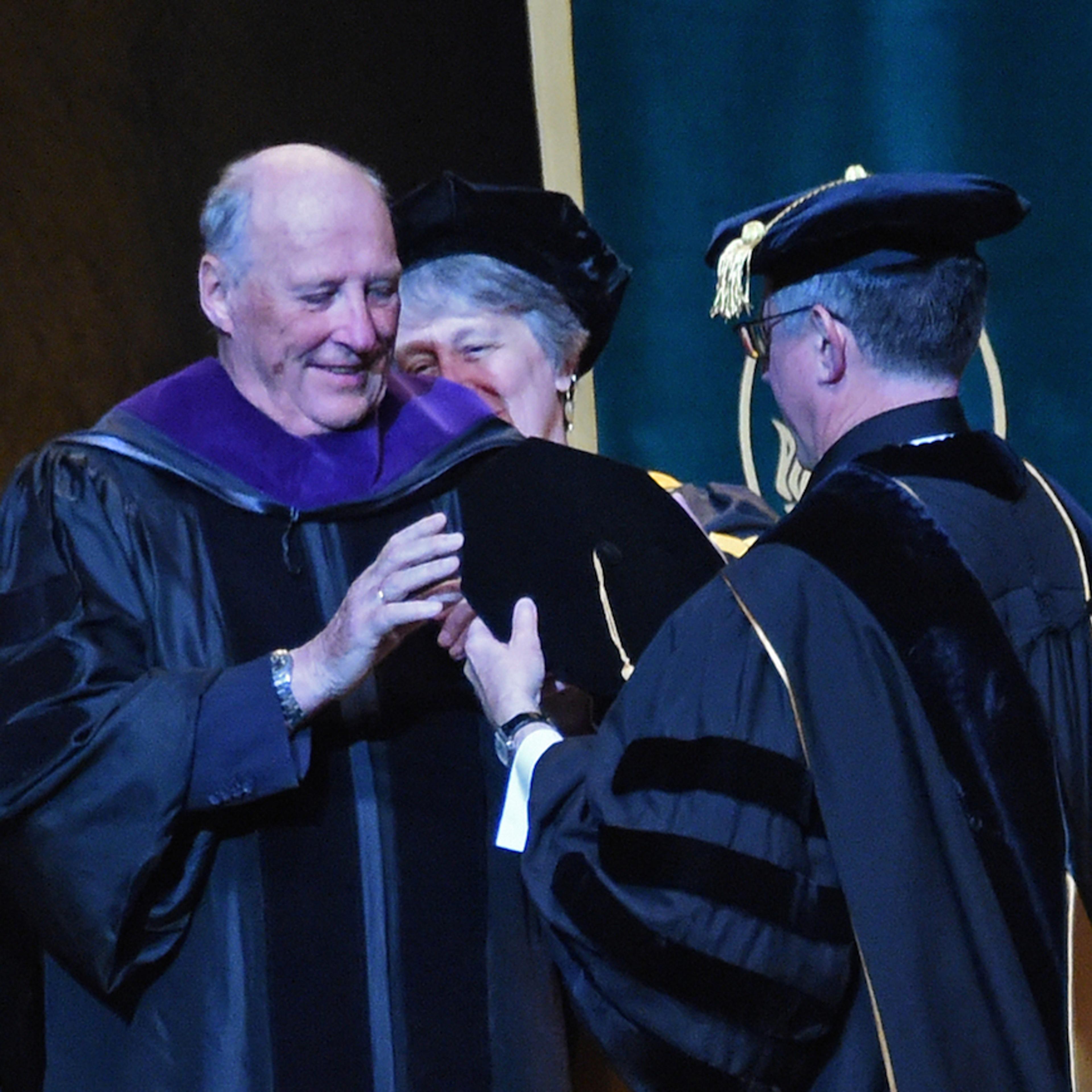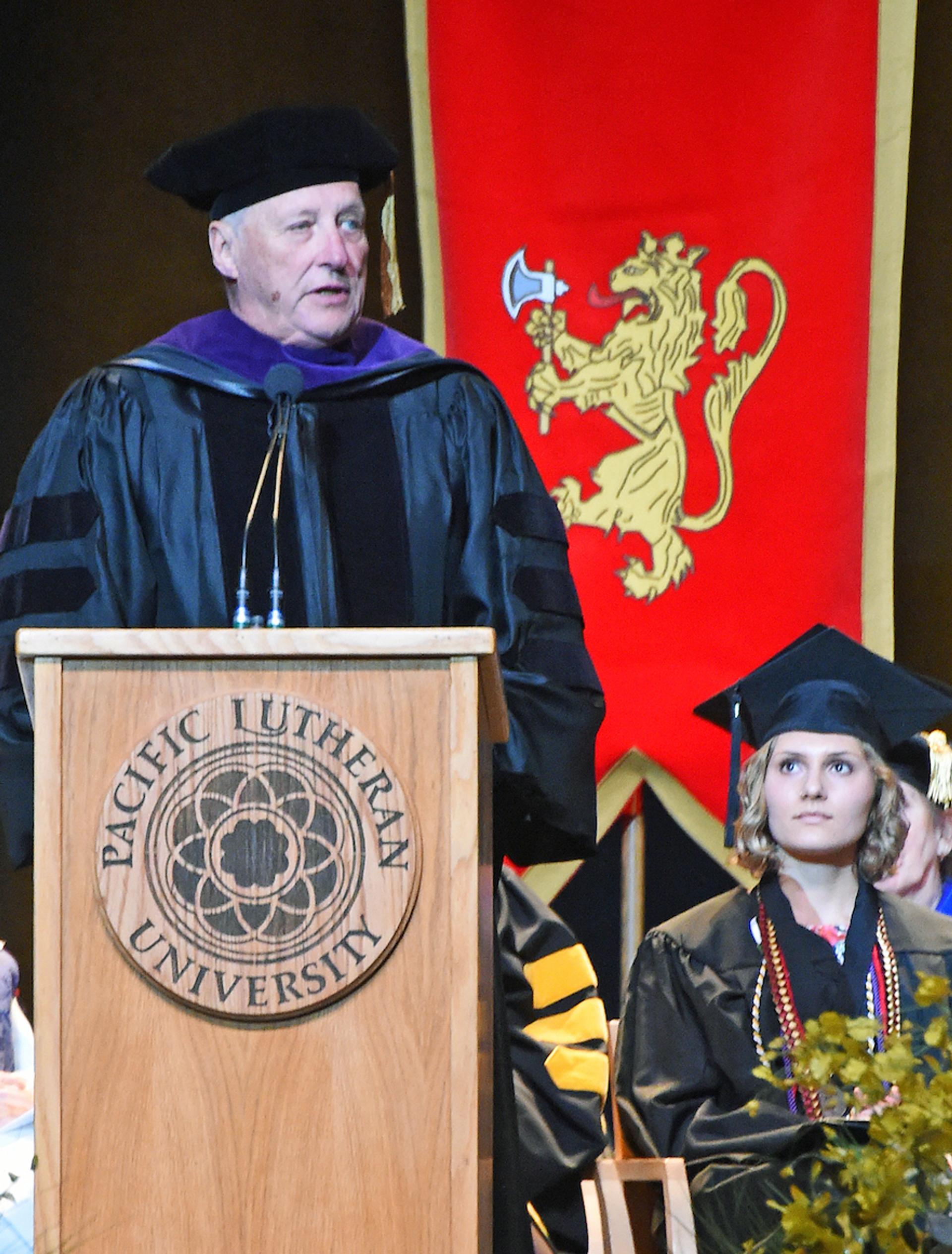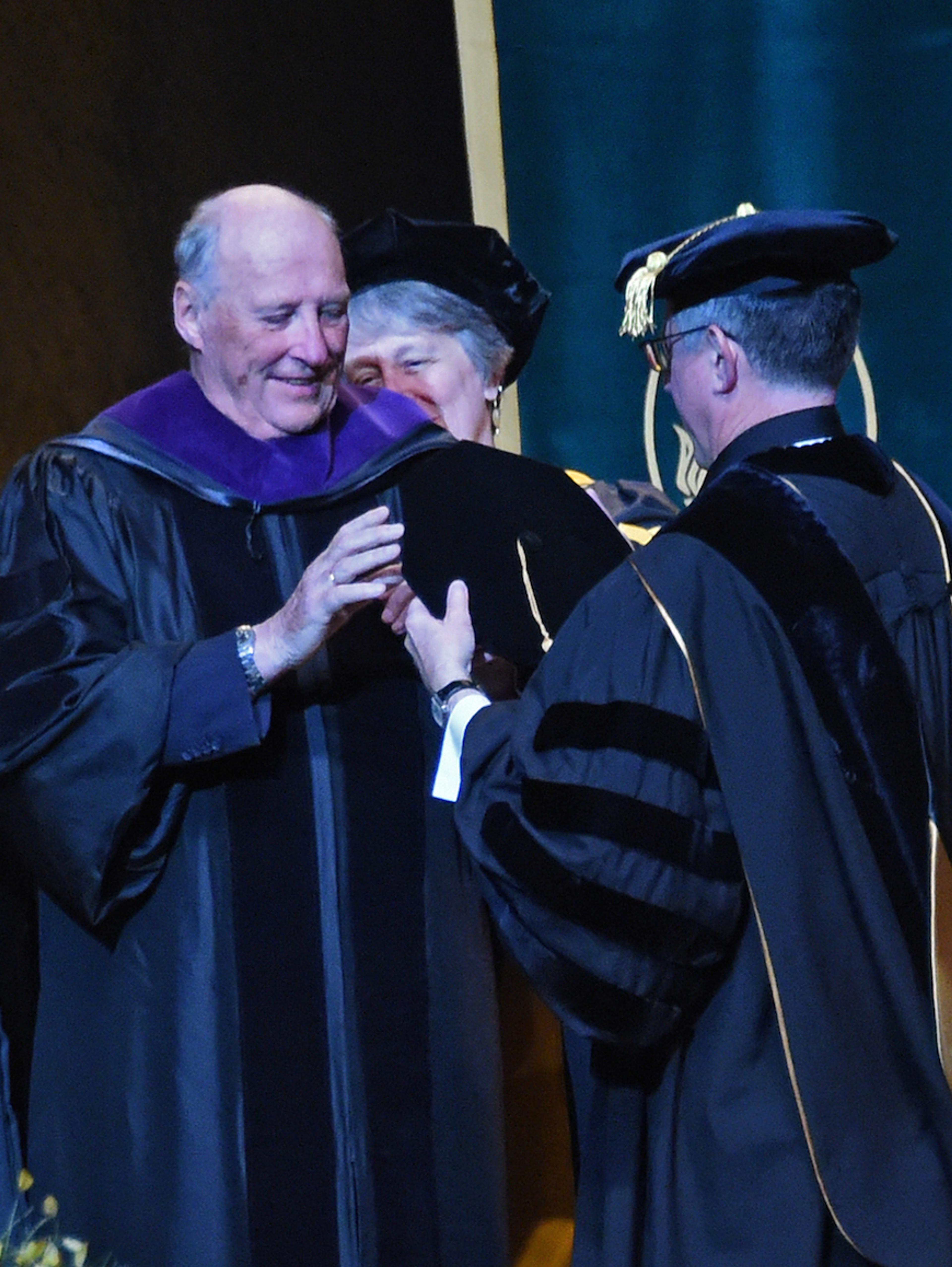 Kong Harald ble også utnevnt til æresdoktor - jure dignitatis - under seremonien i Tacoma Dome. Kongen takket for hedersbevisningen, og mente han nå sto på like fot med Dronningen som ble samme ære til del under besøket for 20 år siden: