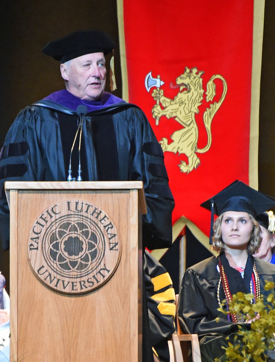 I Tacoma Dome var årets avgangsstudenter samlet til «commencement ceremony» - den høytidelige seremonien som markerer avslutningen på deres akademiske studium, og hvor de mottar sine avgangsdiplom. Kong Harald talte til studentene om viktigheten av utdanningen de nå har fullført, og gratulerte dem alle på den store dagen: