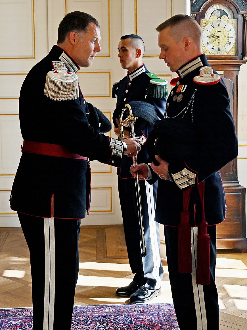Gardesjef Flom overrekte Brigader Leif Schanches ærevising – ein sabel – til løytnant Mads Østereng Bakken. Løytnanten er til dagleg troppssjef i 3. gardekompani og har gjennomført tenesta si på ein eksemplarisk måte. Han har såleis vore eit eksempel til etterfølging for både befal og gardistar i Garden.