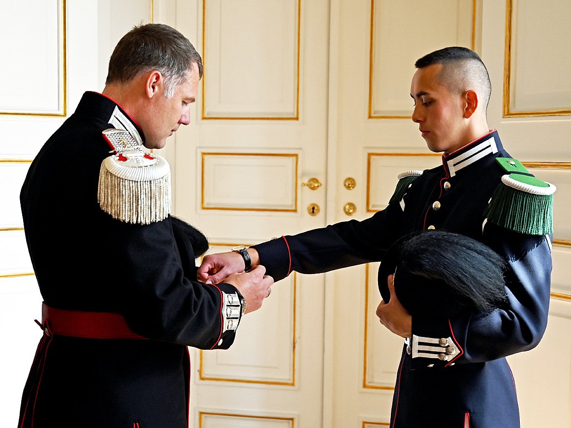Gardesjefen, oberstløytnant Vegard Flom, overrekte utmerkingane til gardistane i nærvær av Kongen. Begge mottakarane tenestegjer ved musikktroppen i 3. gardekompani.