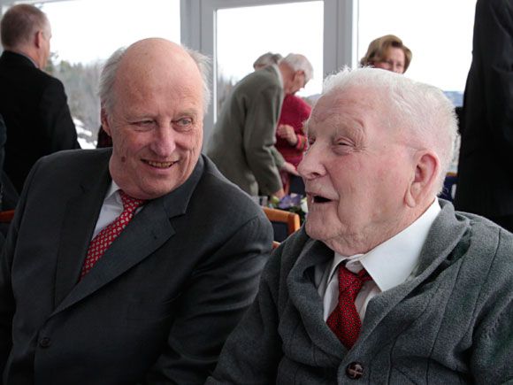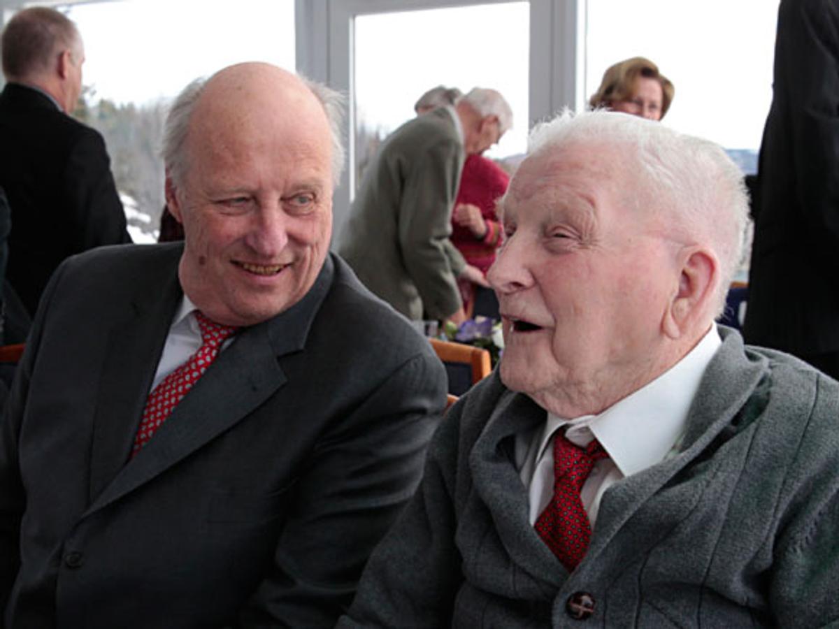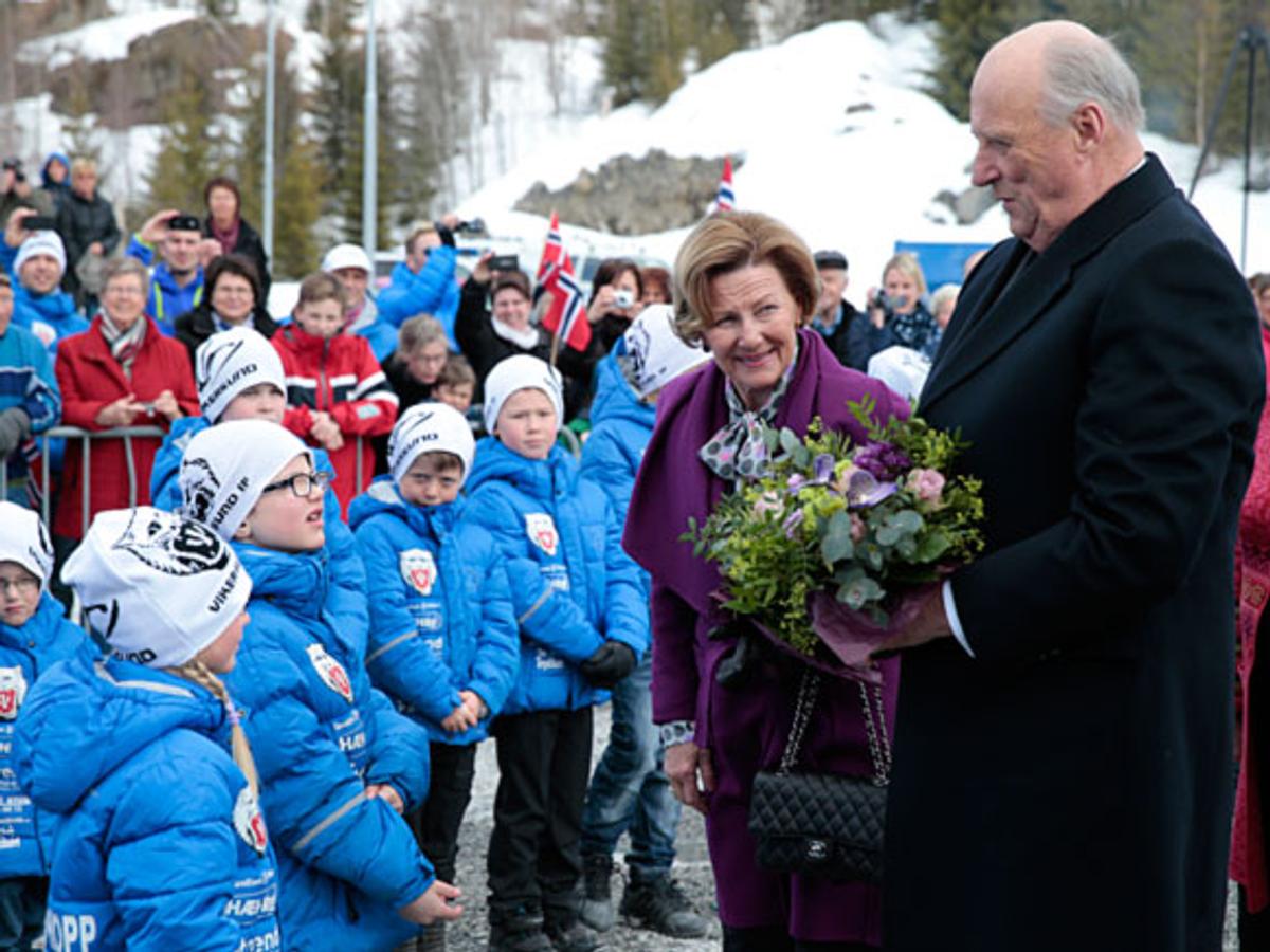 Da bilen til Kongeparet stansa opp utanfor Vingen – praktbygget på toppen av Vikersundbakken – vart dei møtte av fylkesmann Kirsti Kolle Grøndahl og ordføraren i Modum, Terje Bråthen. Kongeparet fekk blomster av Ingrid Solbakken (6) og William Fidjestøl (7), som begge er med i Vikersund Hoppgruppe, før dei gjekk inn for å treffe dei spreke 100-åringane.