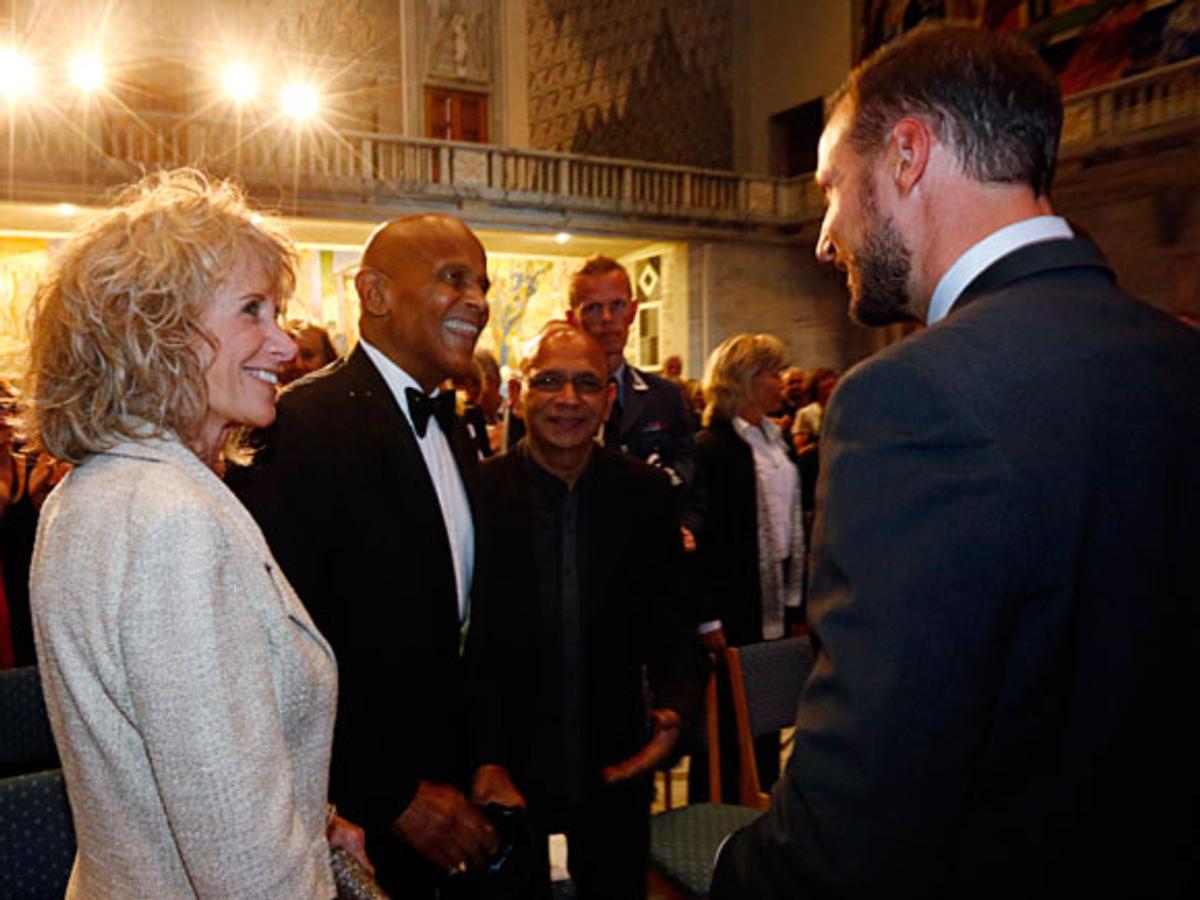 Harry Belafonte satt ved Kronprinsens side under åpningsseremonien. I 1959 ble Belafonte den første afroamerikanske artisten til å motta den prestisjetunge Emmy-prisen.