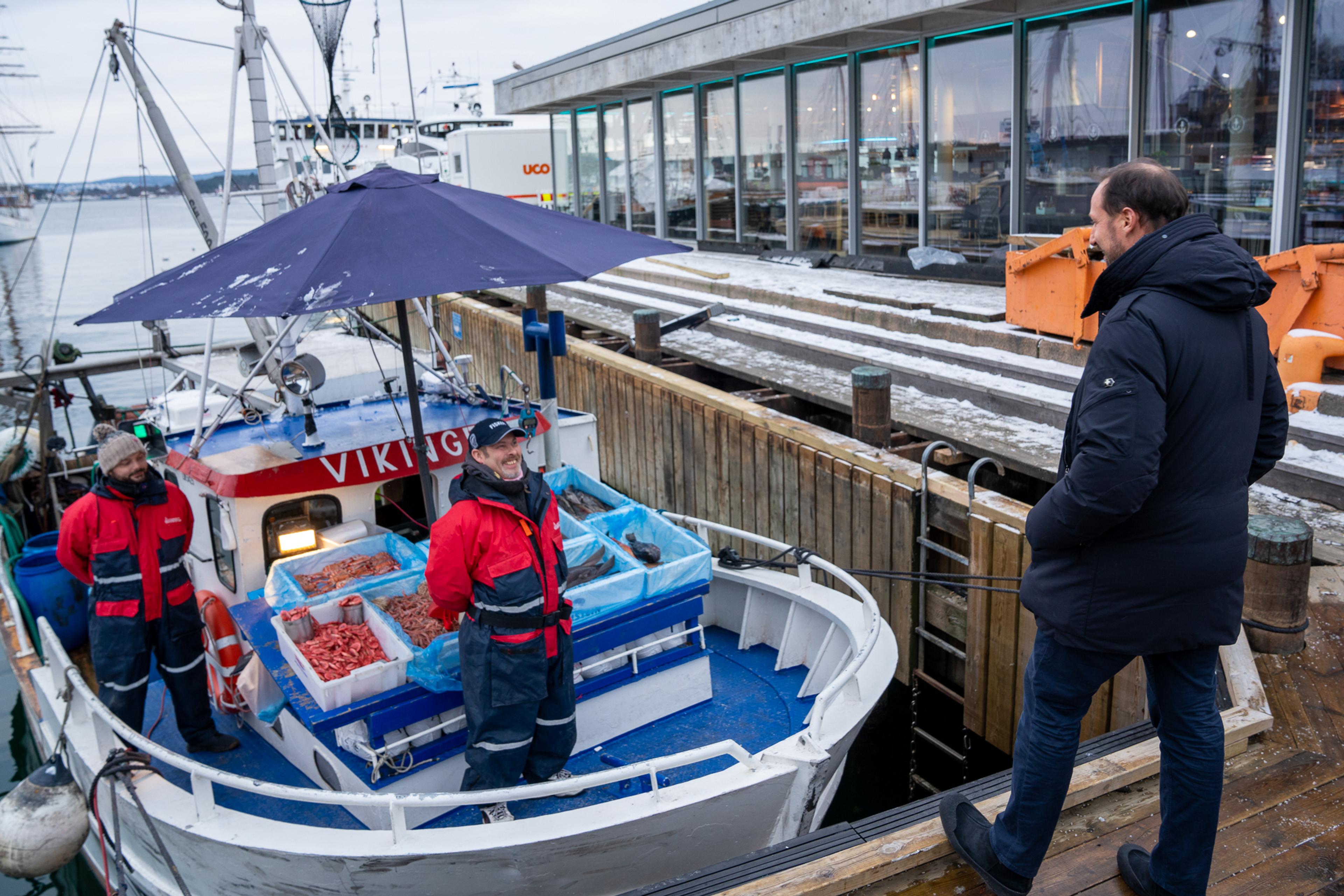 Kronprins Haakon fikk også mulighet til å hilse på Sigurd-Andre Kristoffersen som er skipper på reketråleren «Vikingen». Som en av de omtrent 92 000 menneskene som jobber i sjømatnæringen i Norge kunne han fortelle om sine erfaringer det siste året. For en som vanligvis legger til kai i Oslo og selger reker og andre delikatesser fra havet direkte til turister og Oslos befolkning har også han merket virkningene av pandemien.