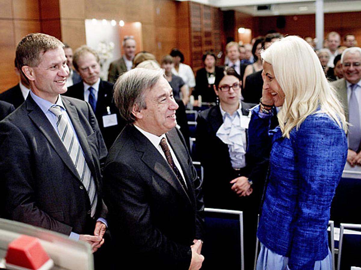 Kronprinsesse Mette-Marit var også til stede da FNs høykommissær for flyktninger Antonio Guterres gjorde opp status for verdens flyktningsituasjon. I løpet av de to dagene som konferansen varer, skal deltakerne drøfte hva stater og organisasjoner kan gjøre for å forebygge flukt, i form av klimatilpasning, katastrofeberedskap og tidlig varsling, - og hvordan det humanitære systemet bedre kan møte utfordringene.
