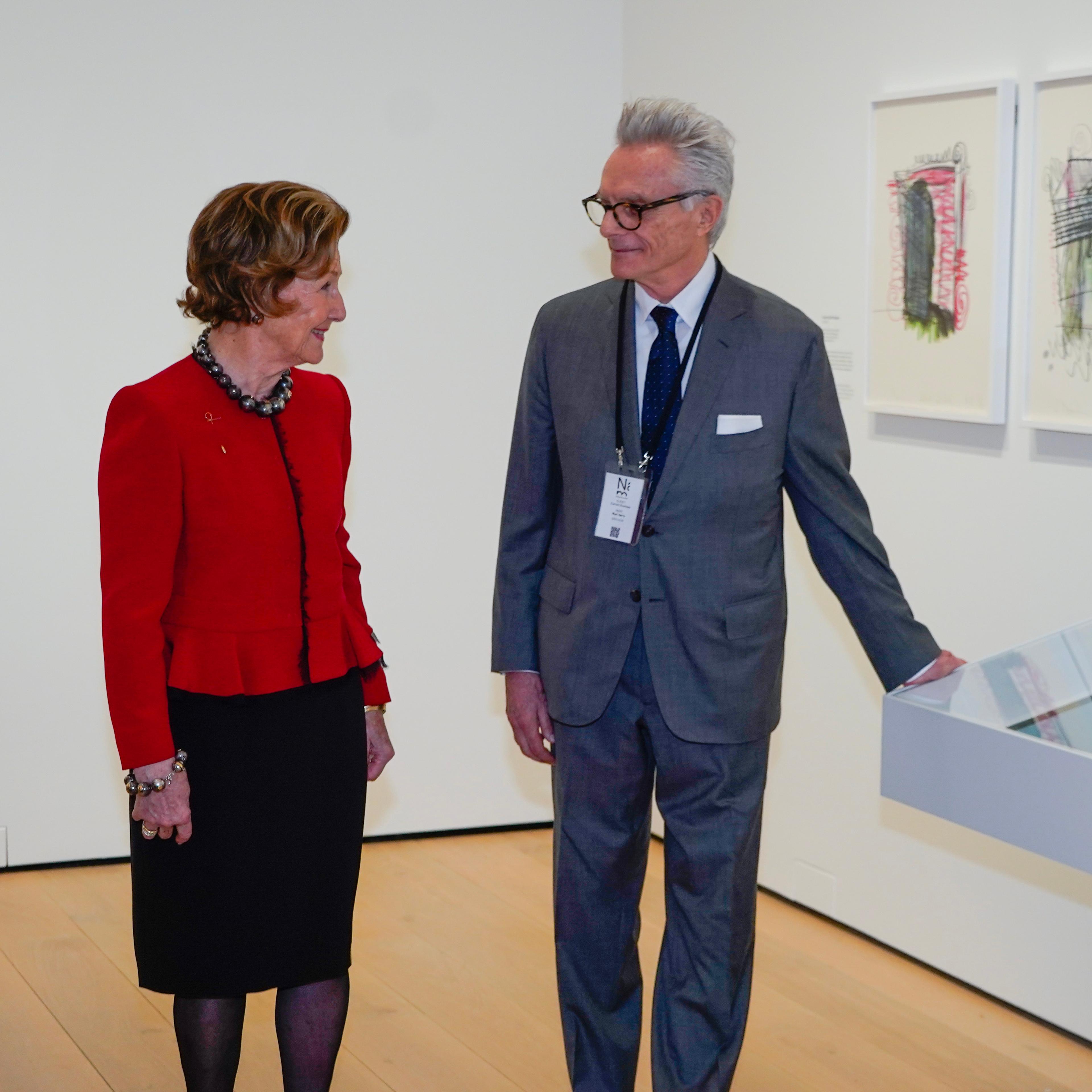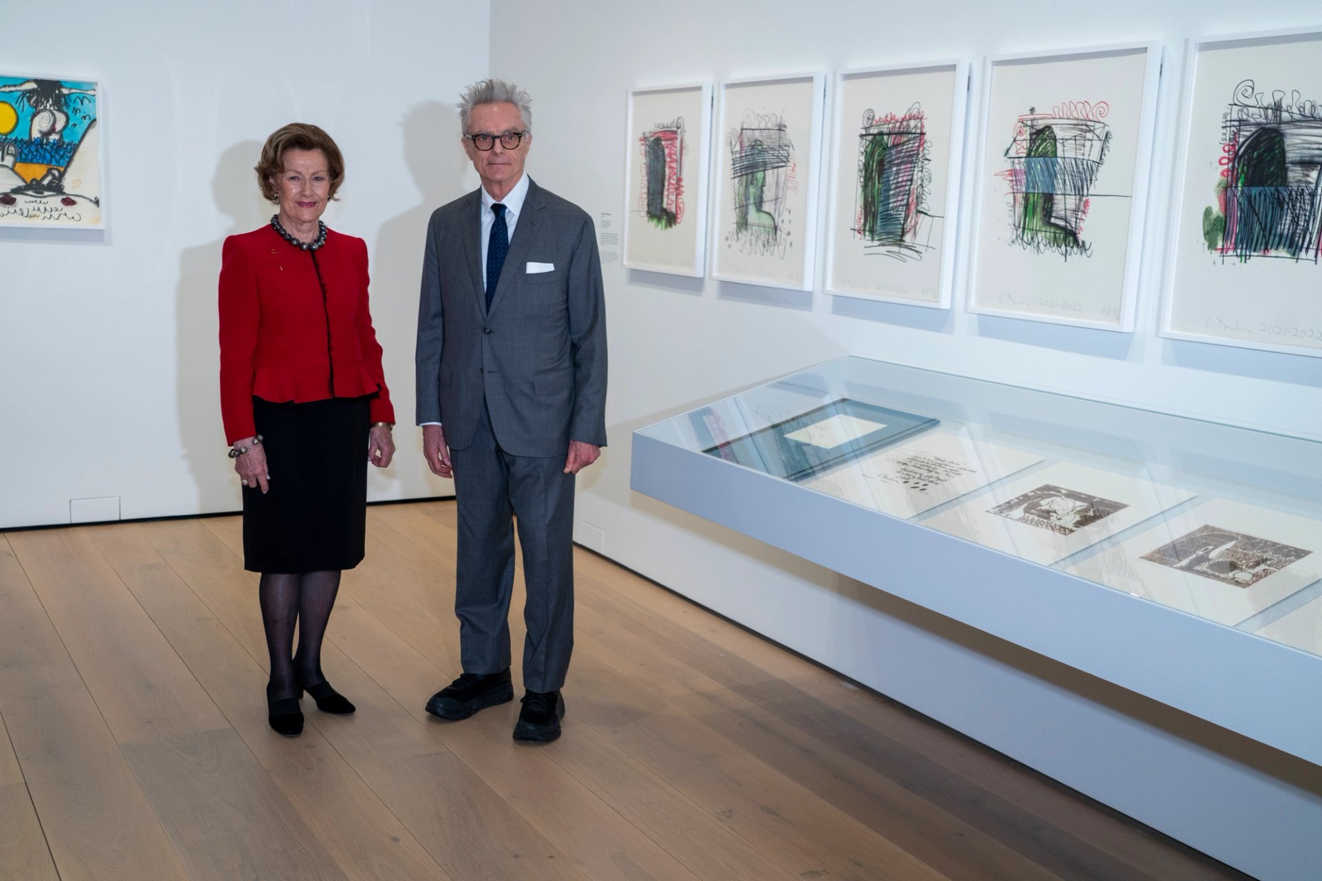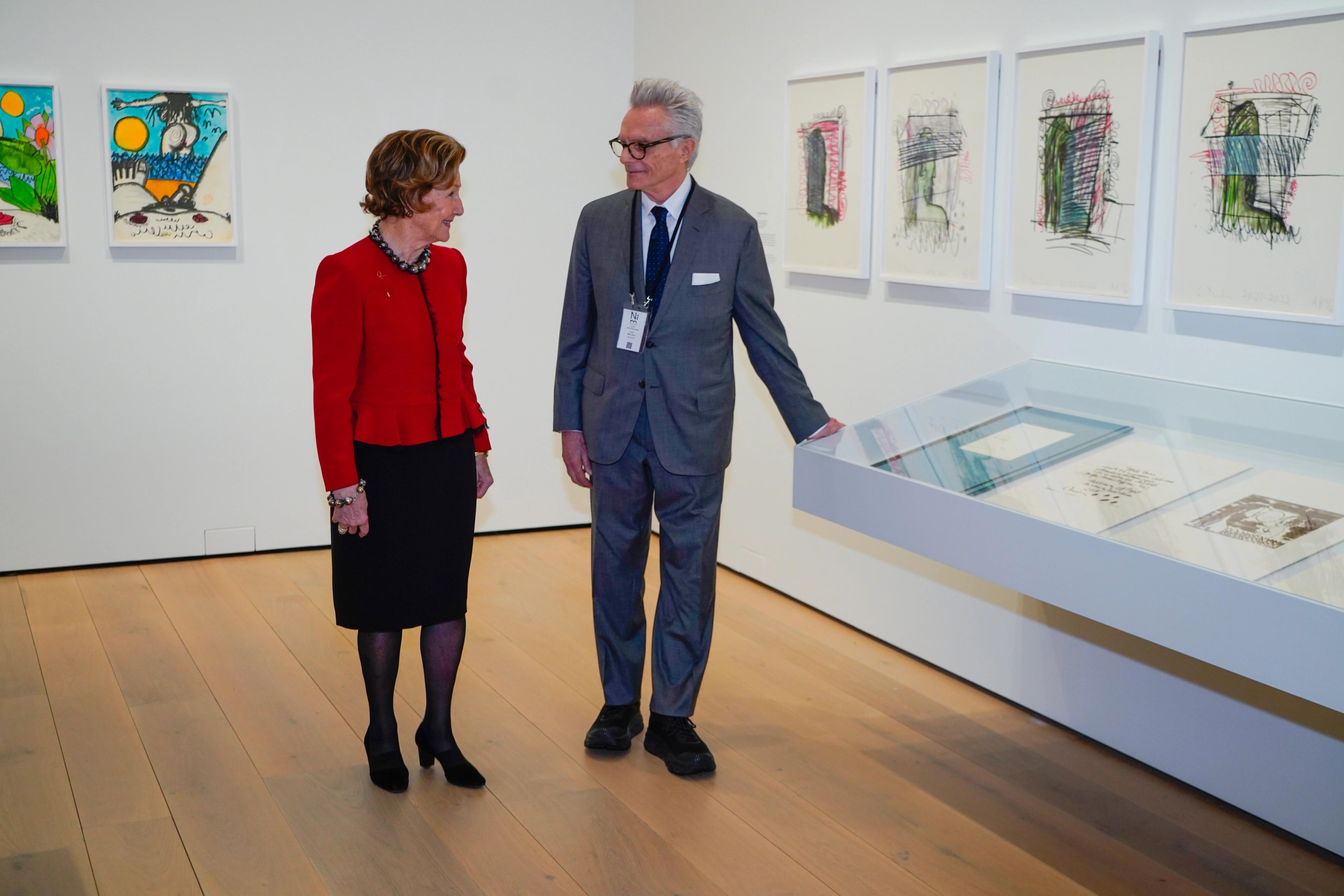 Hennes Majestet Dronning Sonja åpnet utstillingen «Carroll Dunham. Hvor er jeg? Grafikk 1985-2022» på Nasjonalmuseet i Oslo torsdag kveld.