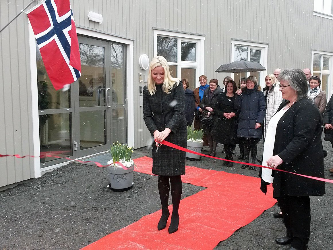 Kronprinsessen klippet over den røde tråden for å markere åpningen av nye Kongsberg krisesenter. Daglig leder Anita Skullestad ledet omvisningen i de nye byggene og orienterte om tilbudet.