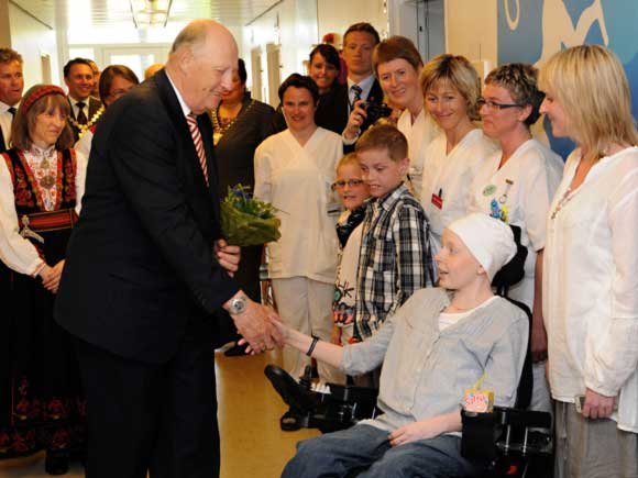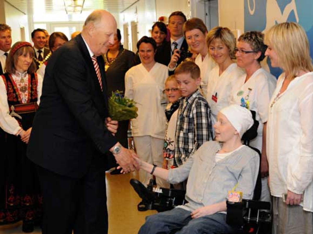 Hans Majestet Kong Harald foretok den offisielle åpningen av nye St. Olavs Hospital i Trondheim i dag. 10 år gamle Sofie Jektevik, som selv er pasient fra barneavdelingen, ga blomster til Kongen ved ankomsten.