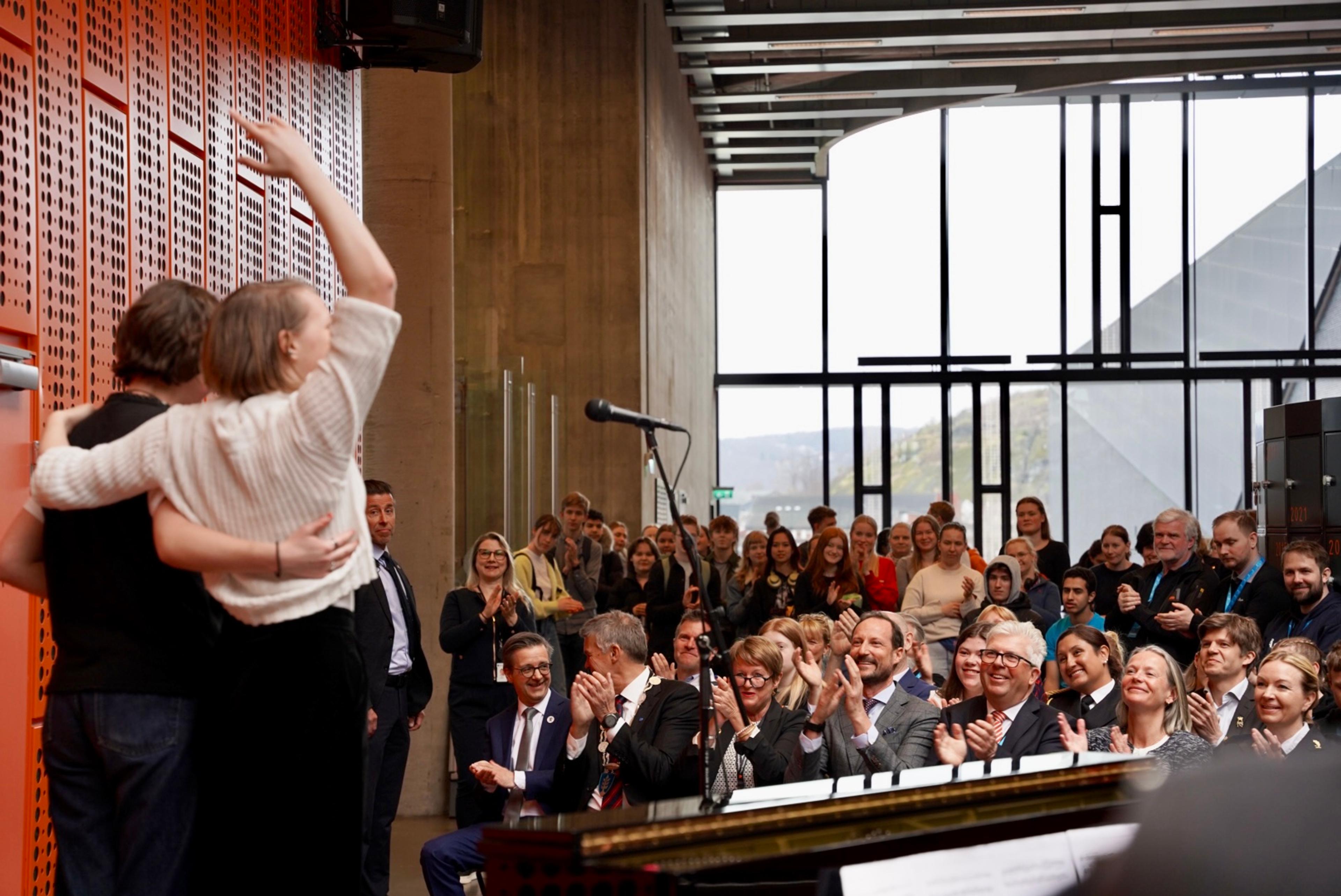 Kronprins Haakon åpnet mesterskapet fra scenen med en hilsen til elevene og snorklipping med hjelp av elever.