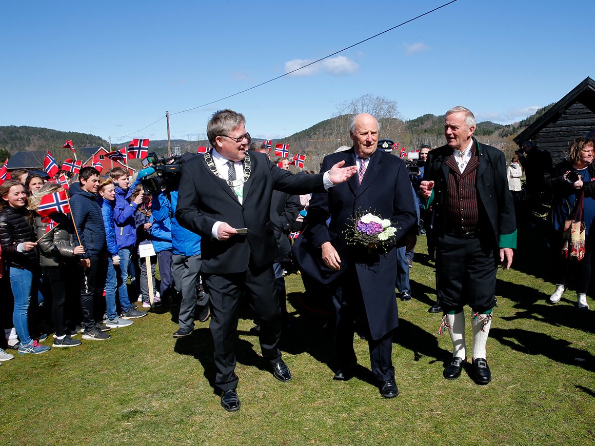 Kong Harald startet besøket i Songdalen på Porsmyr Bygdetun der han ble tatt i mot av ordfører Johnny Greibesland og blomsterbarna Rina-Liora Niyo og Sander Haakon Haugen Hansen. Begge er elever i fjerde klasse ved to av kommunens skoler.