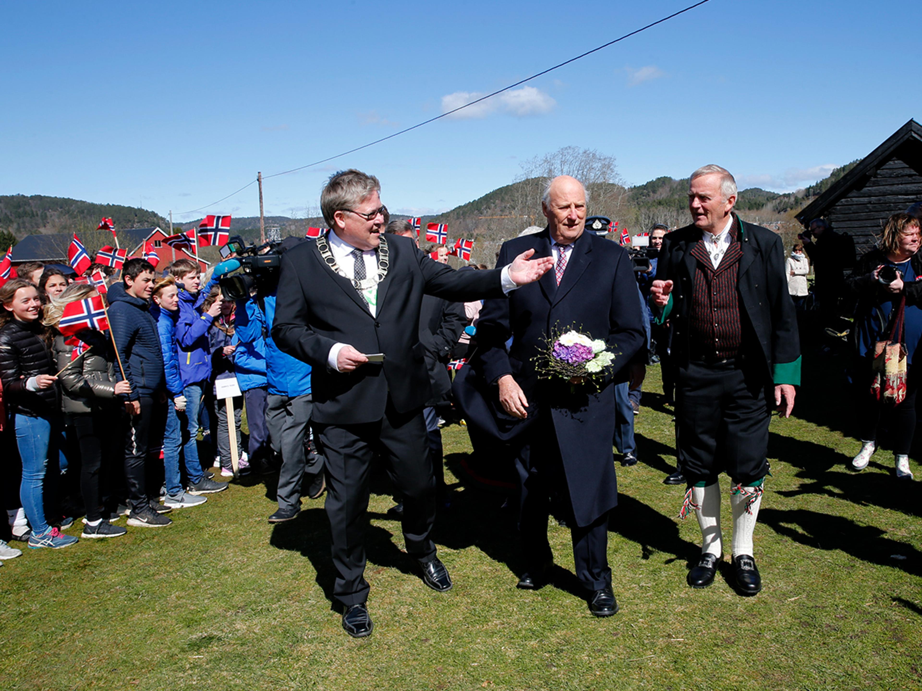 Kongen kom forsinket til bygda i dag. Uventet stort snøfall ga forsinkelser i flytrafikken ut fra Gardermoen. Men vel framme i Sogndal, skinte solen fra blå himmel.