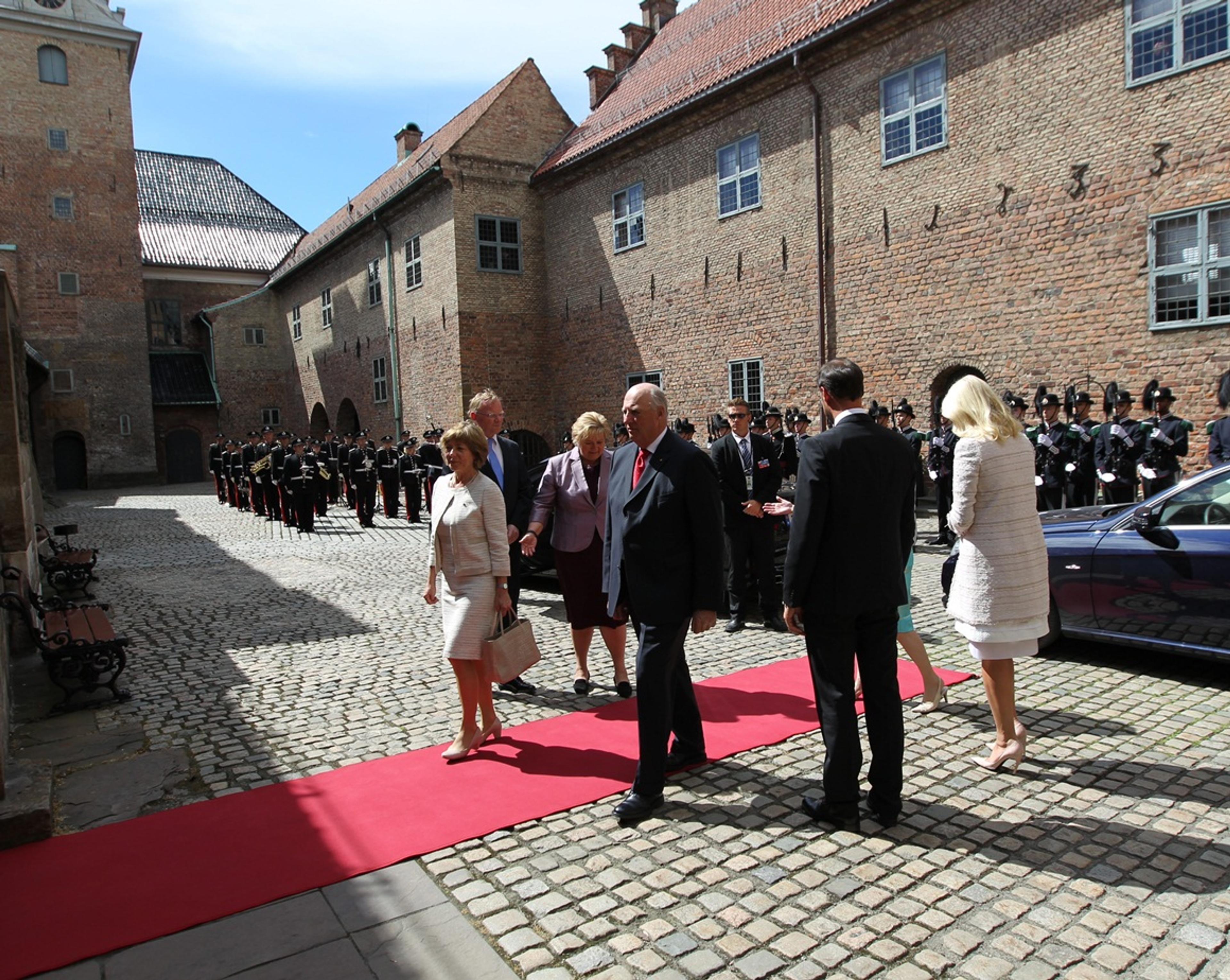 Regjeringen og statsminister Erna Solberg inviterte til lunsj på Akershus slott til ære for President Gauck og fru Schadt i dag. Både Kong Harald og Dronning Sonja, Kronprins Haakon og Kronprinsesse Mette-Marit var til stede.