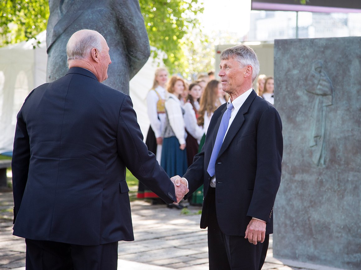 I ettermiddag avduket Hans Majestet Kong Harald og Prinsesse Astrid, fru Ferner Olav Oruds minnesmerke over Kong Olav V på Rådhusplassen i Oslo.