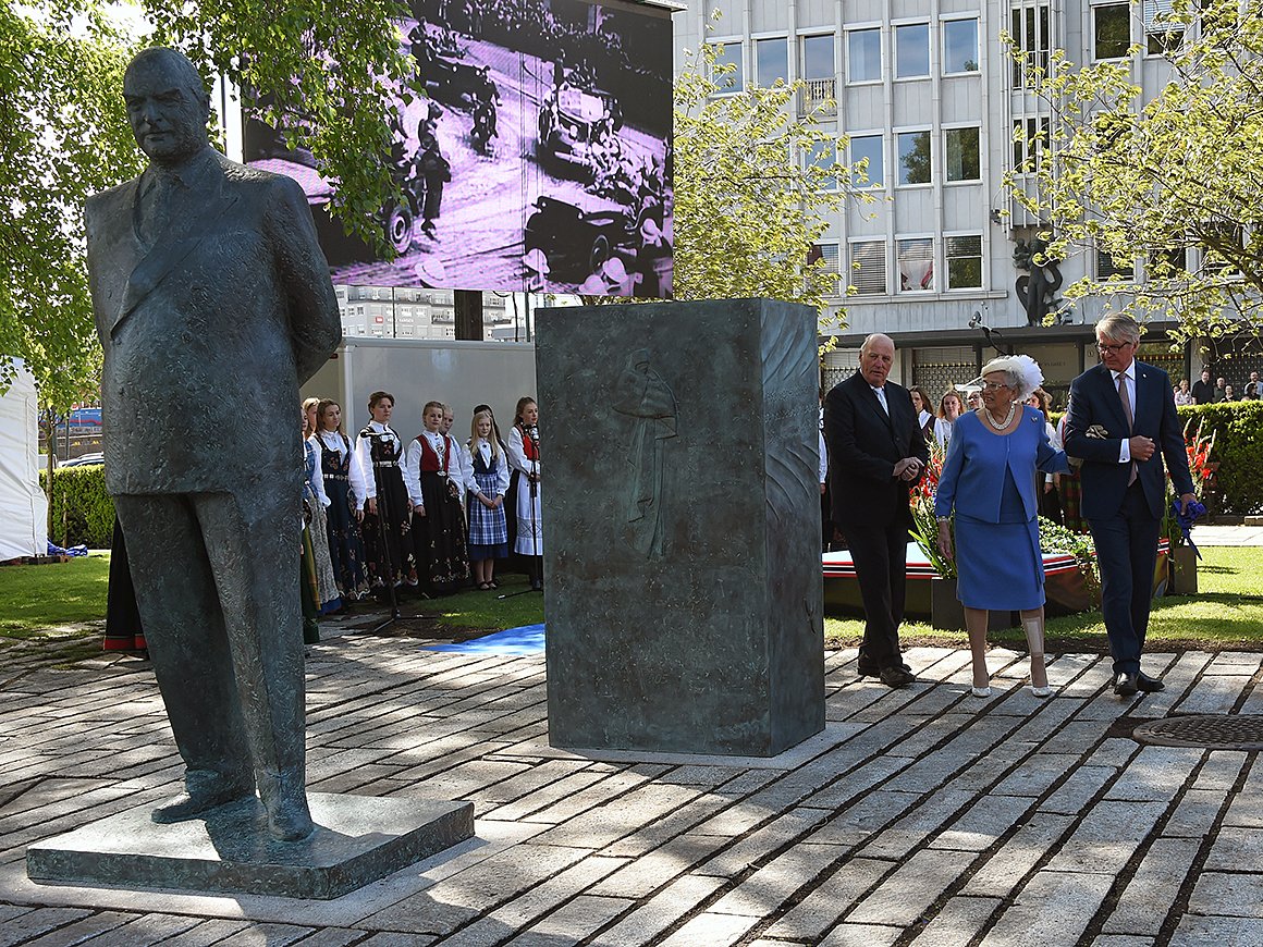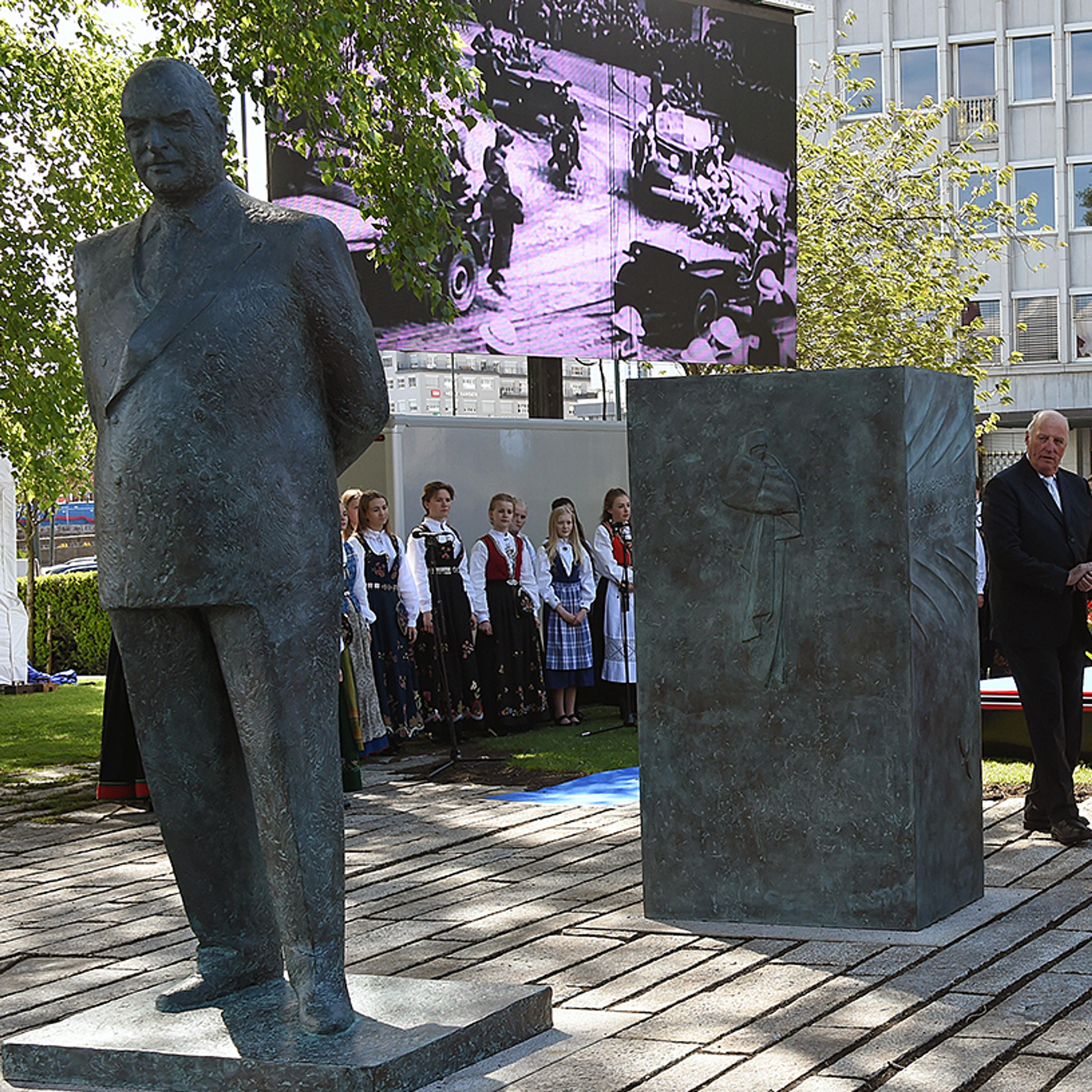 Ordfører Fabian Stang ønsket velkommen, Kong Harald og Prinsesse Astrid foretok selve avdukingen. Både forsvarsminister Ine Eriksen Søreide og forfatter Tor Bomann-Larsen talte. De trakk de historiske linjene, pekte på Kronprins Olav som militær leder - men også folkekongen som i tiden etter 2. verdenskrig samlet nasjonen.