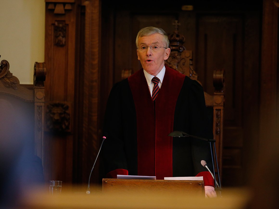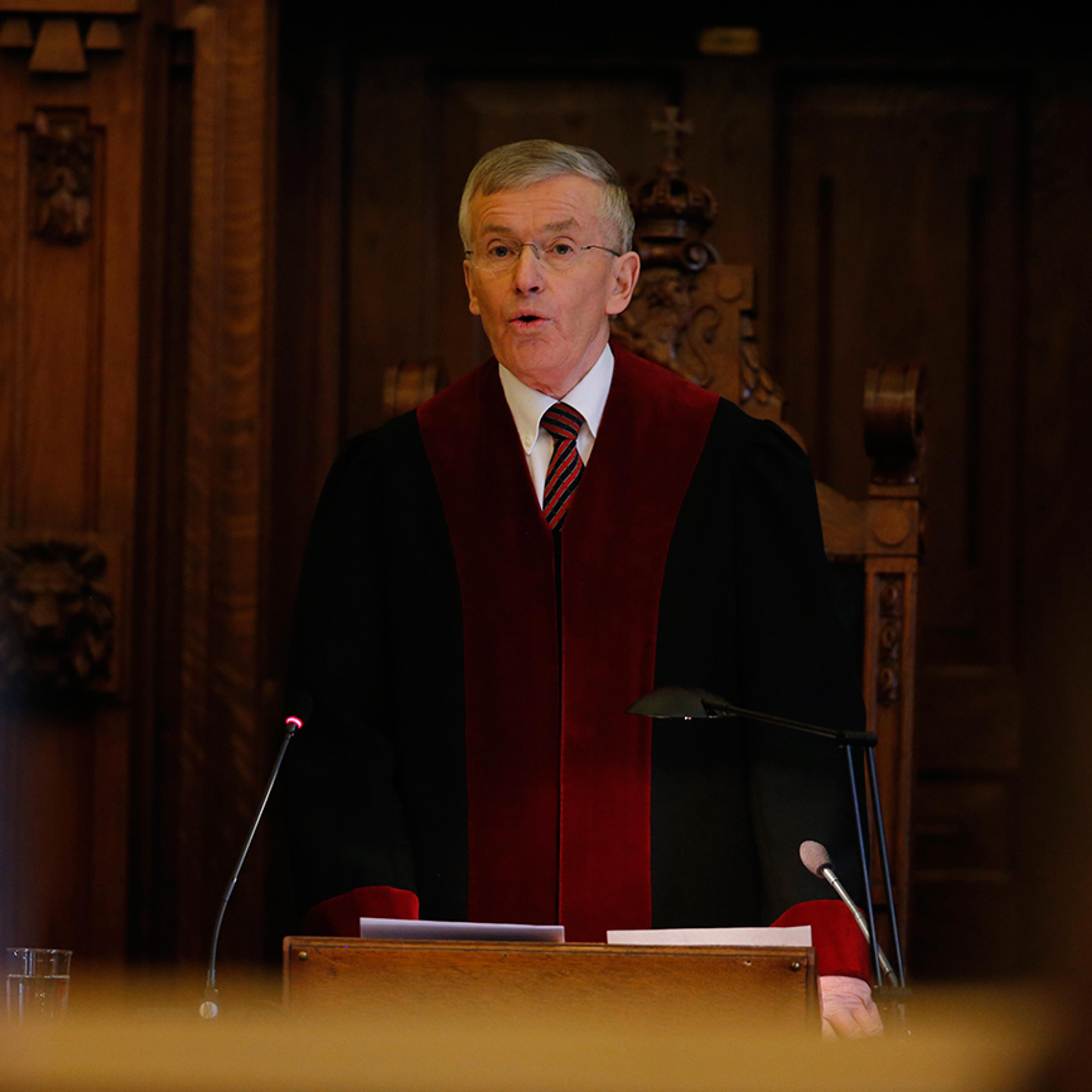 Høgsterettsjustitiarius er leiaren av Høgsterett og rangert som nummer fire i landet, etter Kongen, stortingspresidenten og statsministeren. Alle fire var til stades under avskjedsmarkeringa i dag.