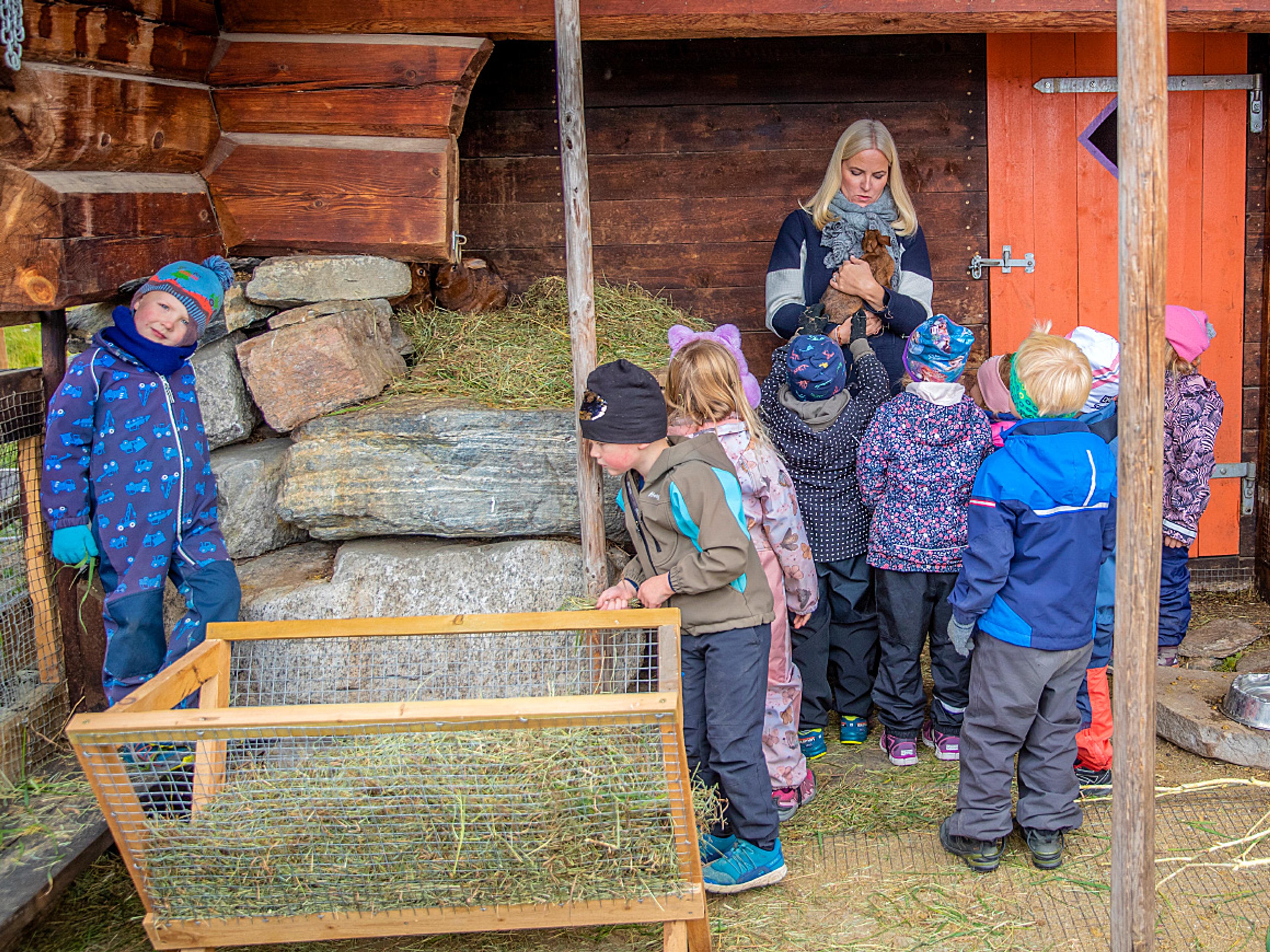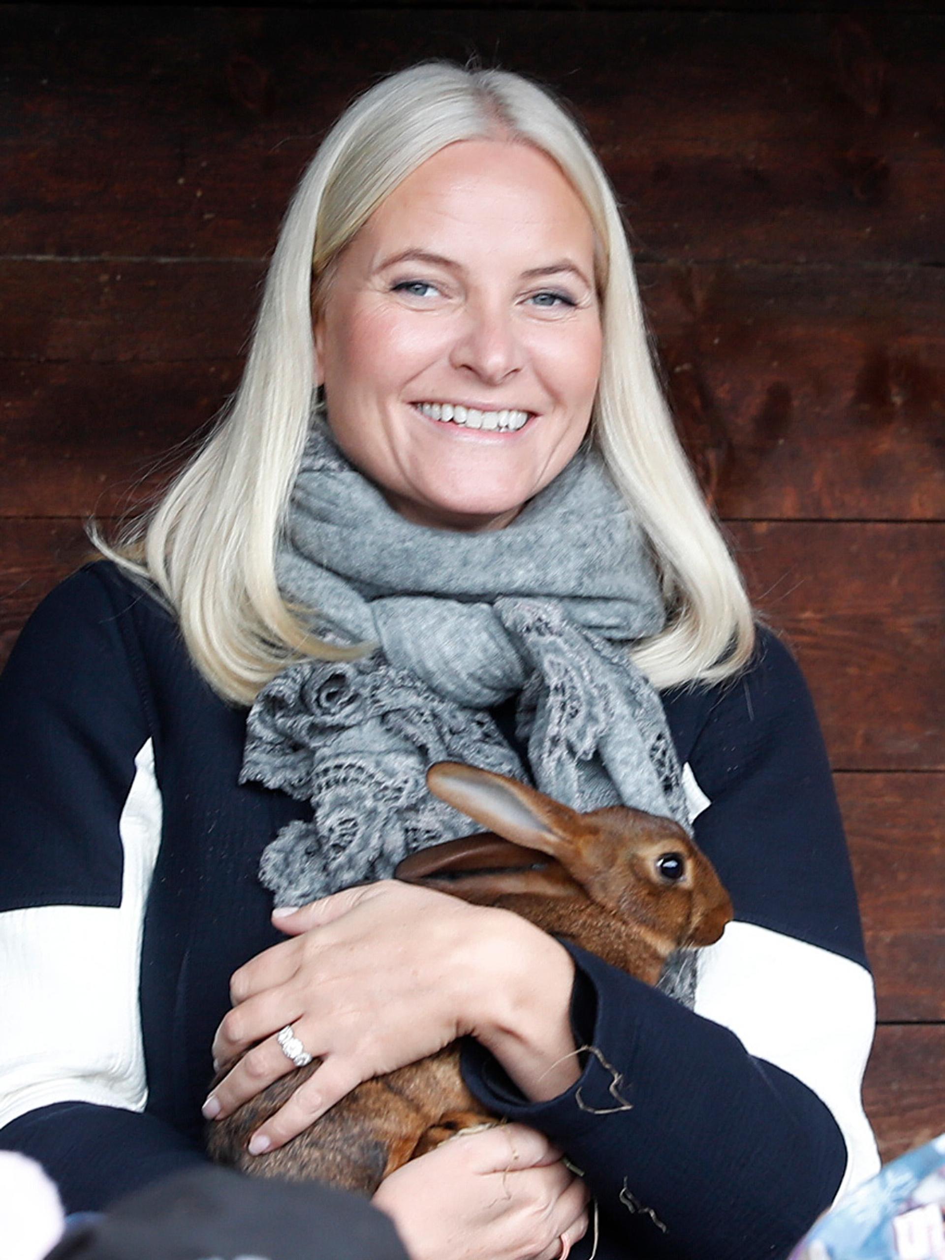 Kronprinsesse Mette-Marit helsar på kaninane. Foto: Marius Gulliksrud, Stella Pictures