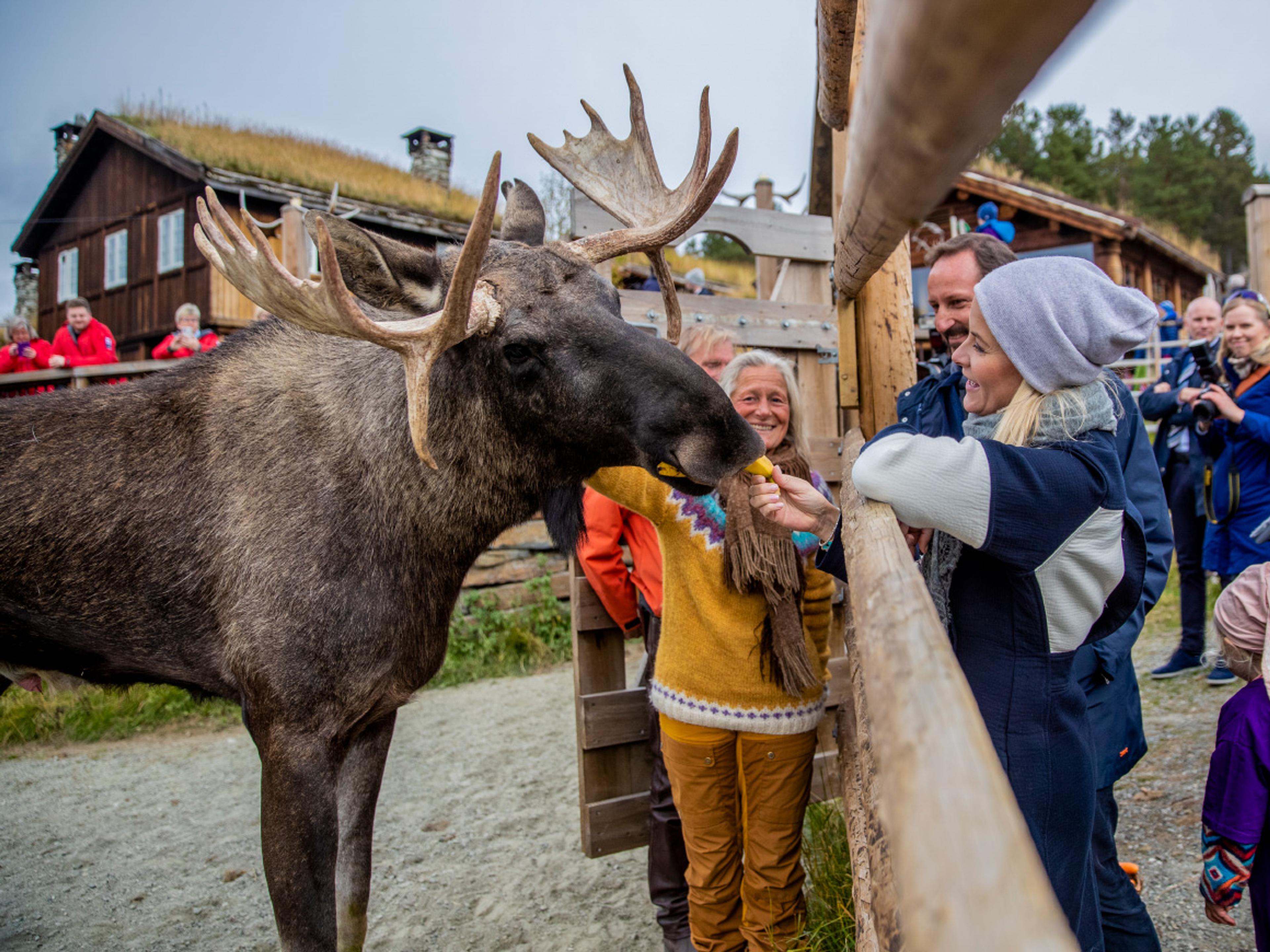 Kronprinsparet helsa på "skogens konge" og fekk òg innblikk i elgjakt og bruken av elg gjennom ulike presentasjonar på tunet.