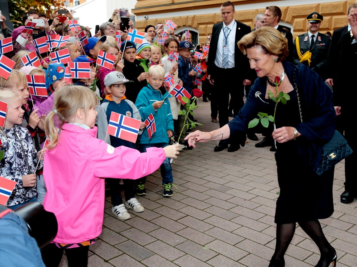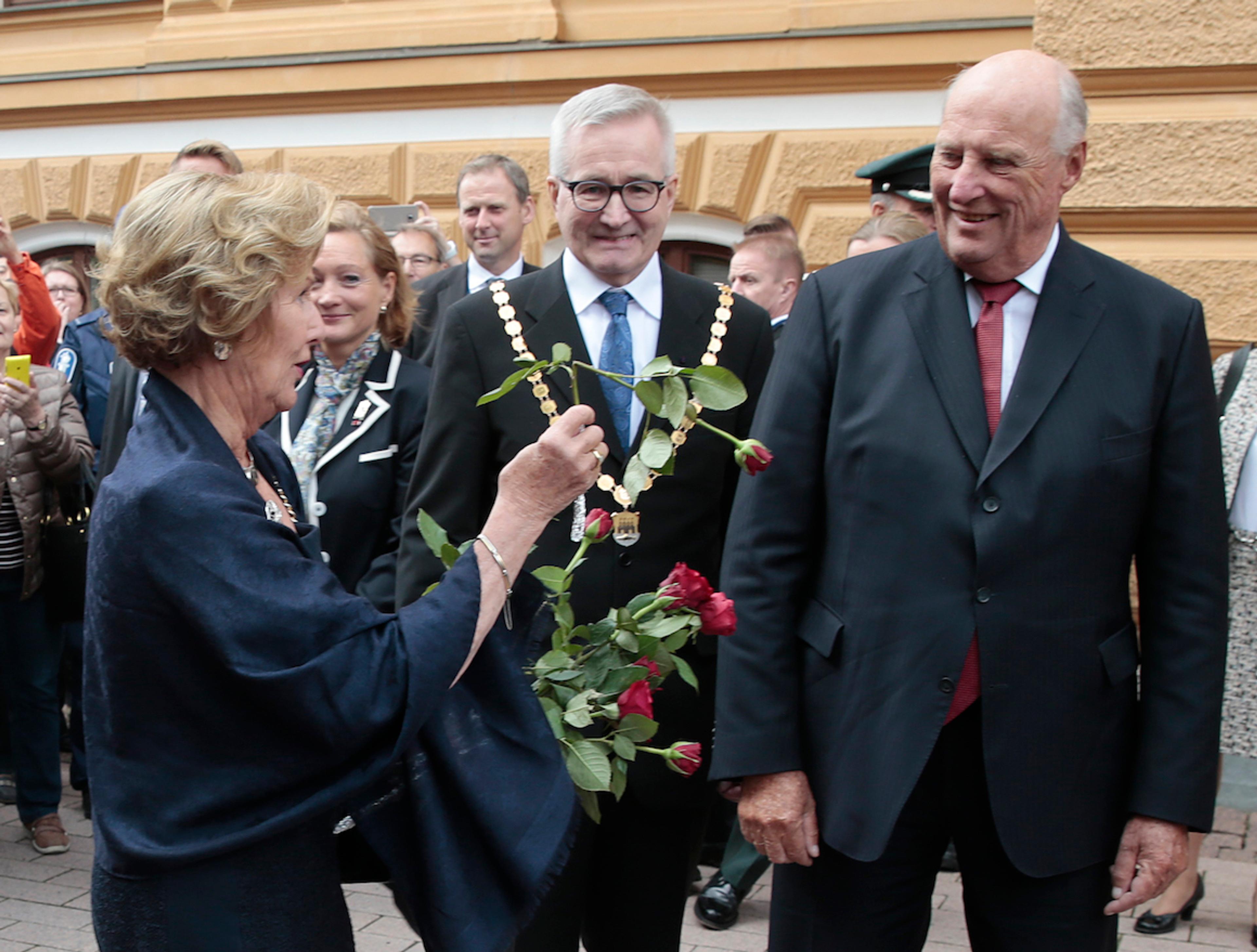 Mange barn var møtte opp med flagg og roser til Dronning Sonja da Kongeparet kom til rådhuset til lunsj. I talen sin sa Kongen seg imponert over kva han hadde sett på universitetet, og ønskte dei lykke til i samarbeidet med norske bedrifter og institusjonar:
