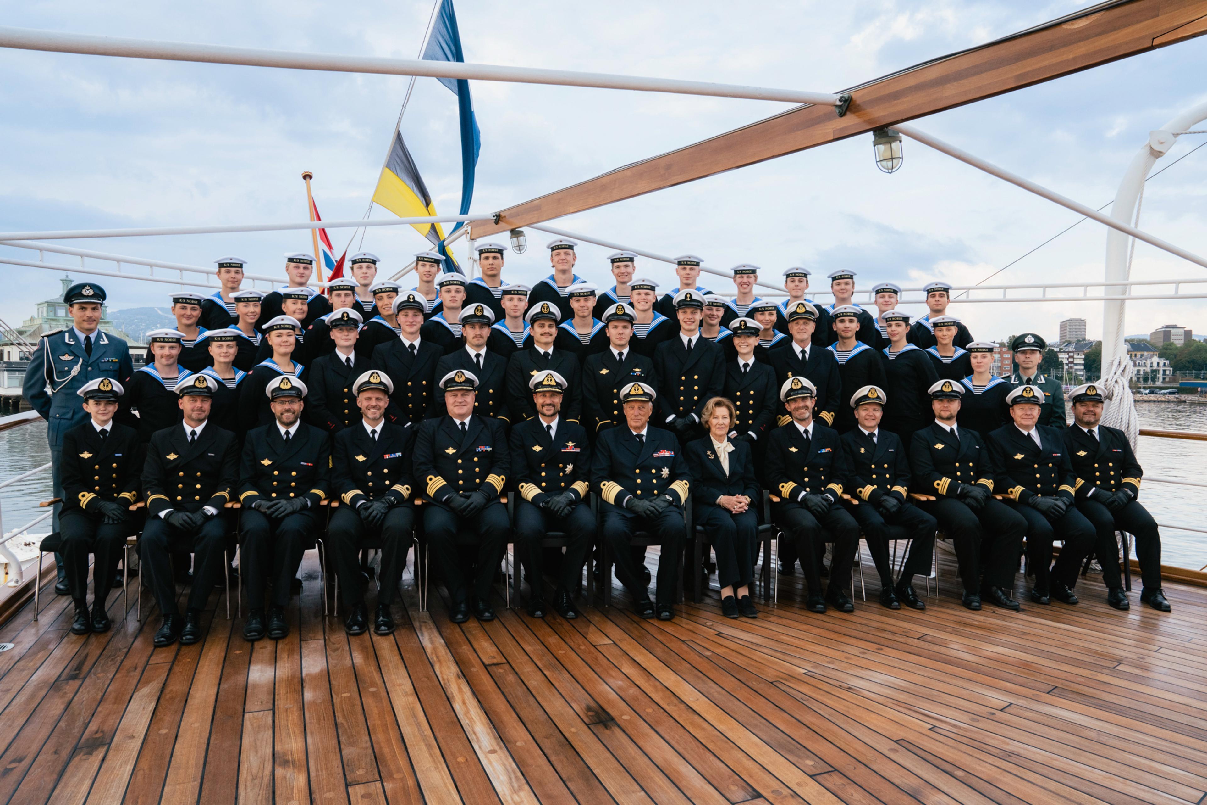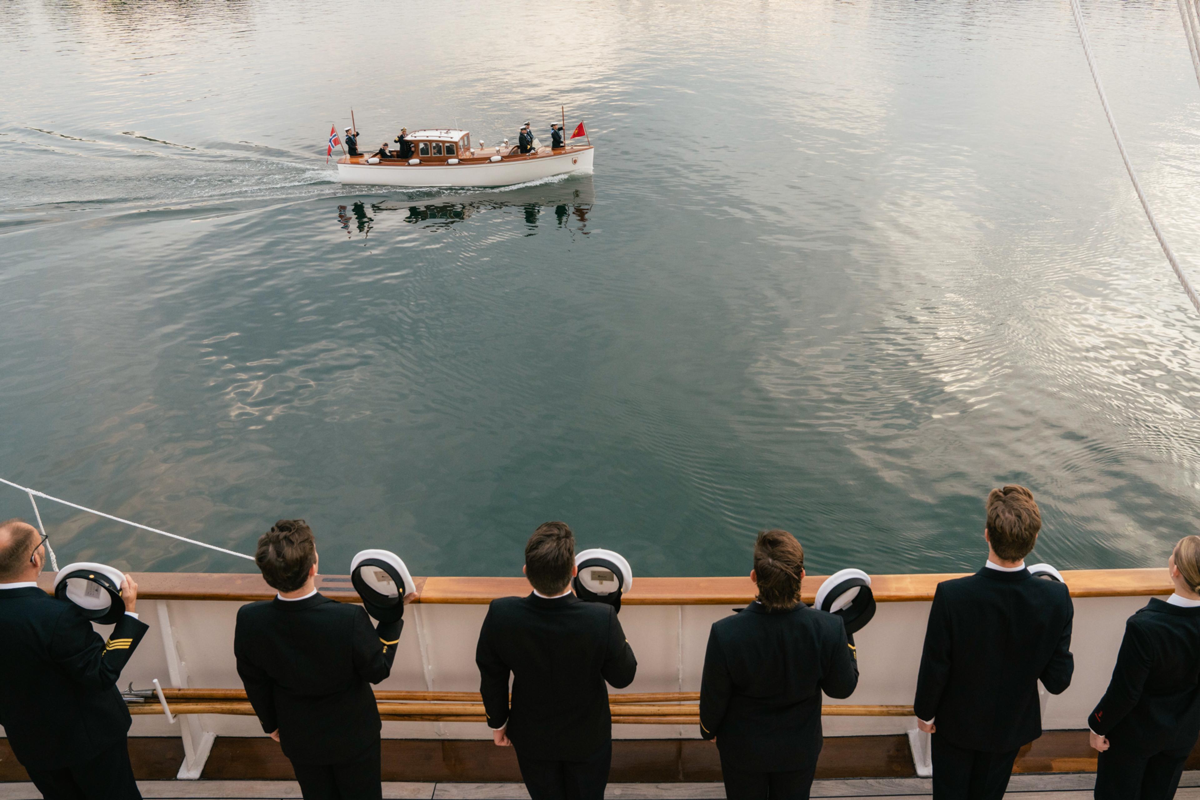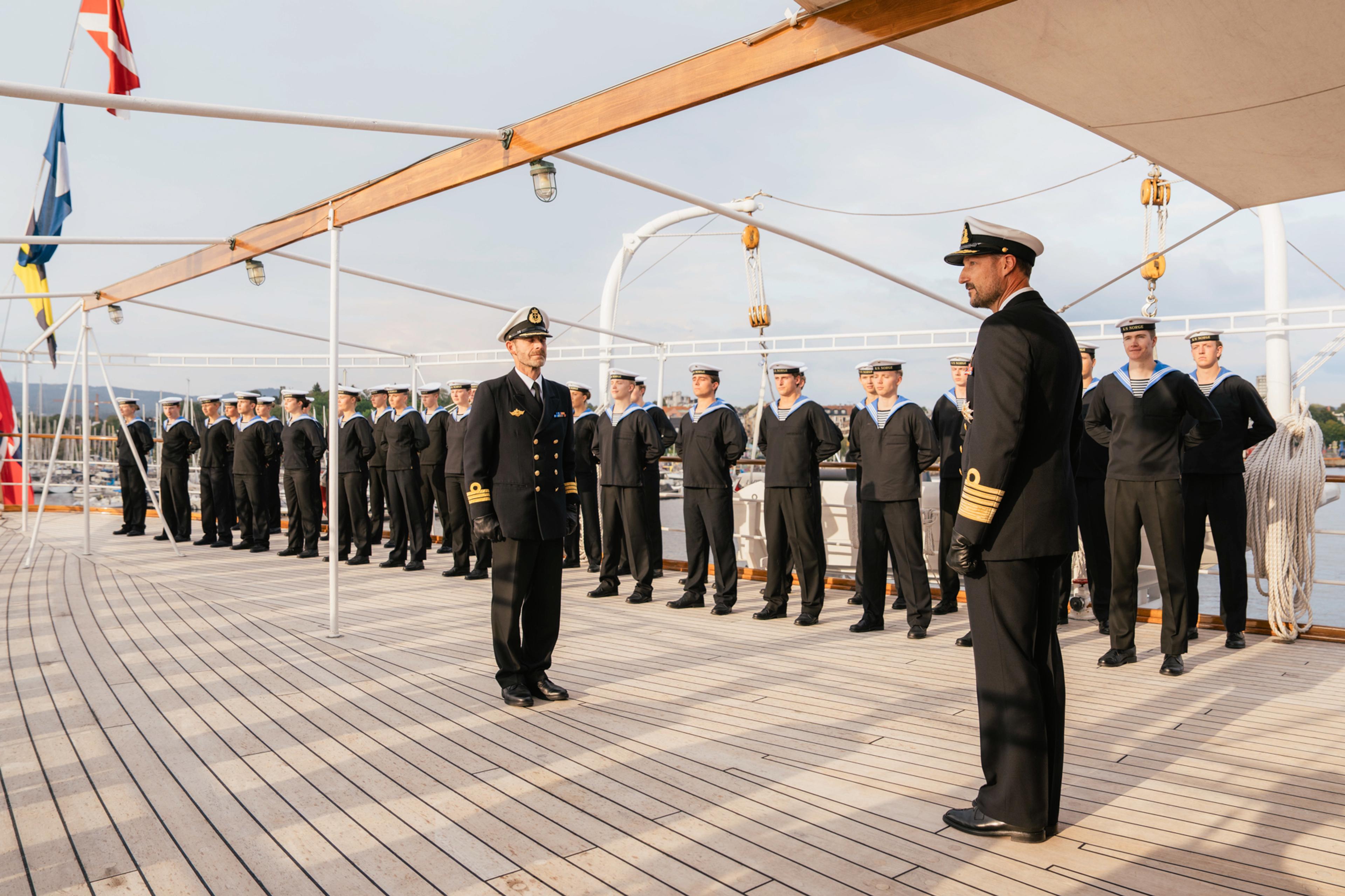 Tradisjonen tru var det oppstilling og inspeksjon av mannskapet på akterdekket. Kronprins Haakon nytta høvet til å takke alle for innsatsen på vegner av Kongeparet og Kronprinsparet. Deretter følgde inspeksjon av fartøyet.