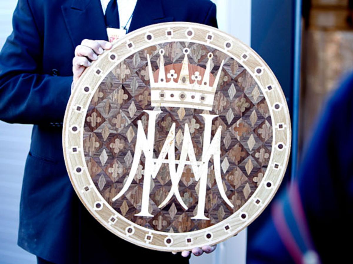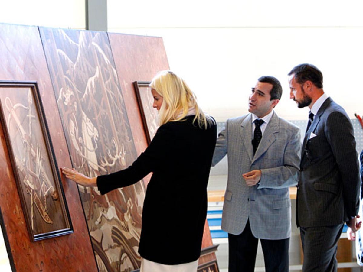 Deretter spaserte Kronprins Haakon og Kronprinsesse Mette-Marit videre til Masis Design AS. Her lages kunstparkett og andre vakre arbeider i tre-mosaikk. Daglig leder Hovhannes Bayadjan viste rundt i verkstedet og fortalte om den unike teknikken som ligger til grunn for arbeidene. Kronprinsparet fikk overrakt sitt eget monogram som tre-mosaikk i gave.