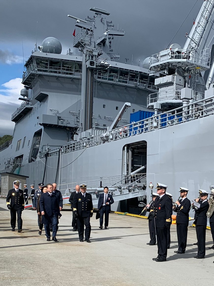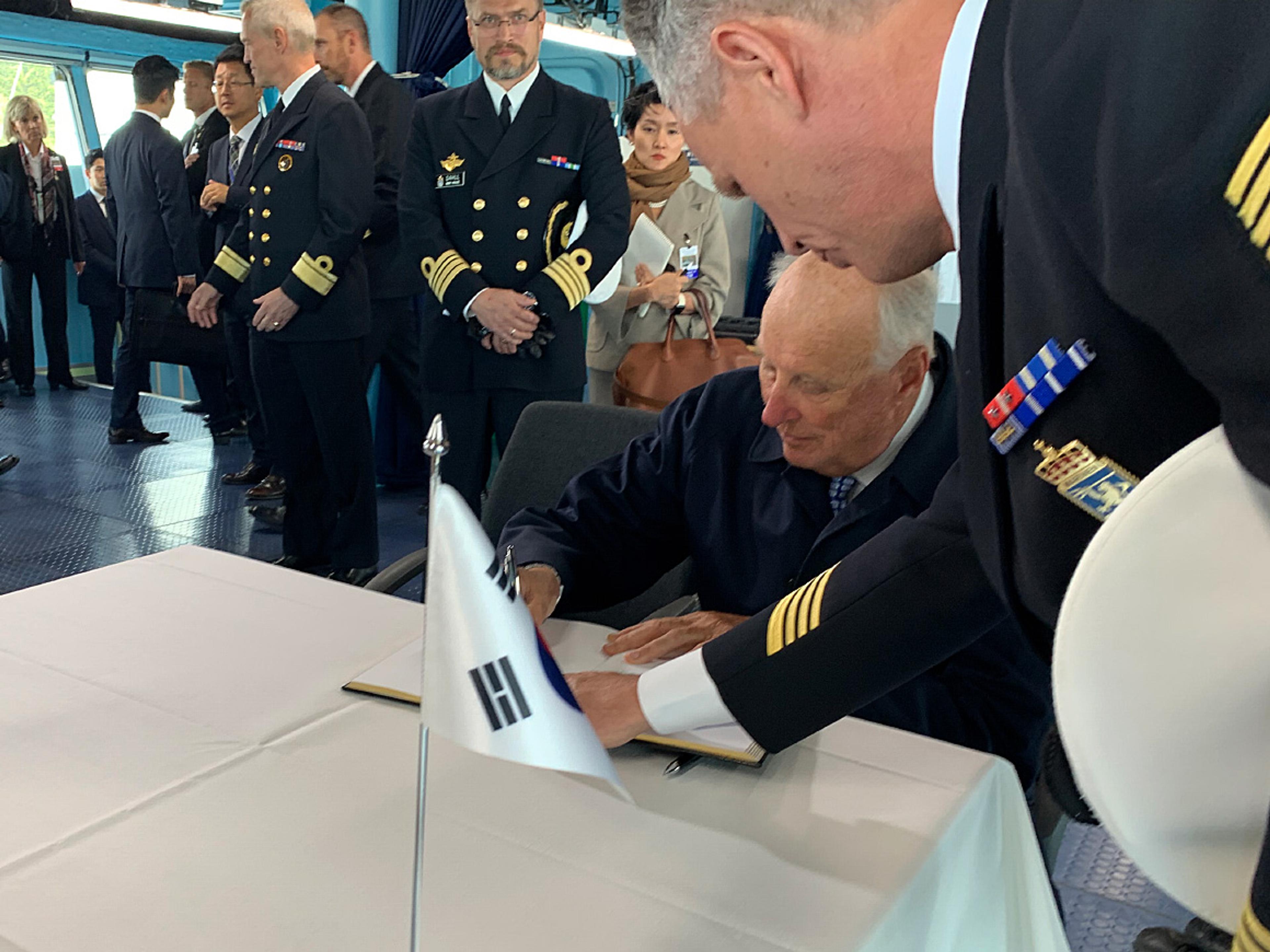 Kong Harald, President Moon og fru Kim fikk en orientering om bord i skipet, der de også fikk se en demonstrasjon av skipets evne til å flytte last over i et annet fartøy.