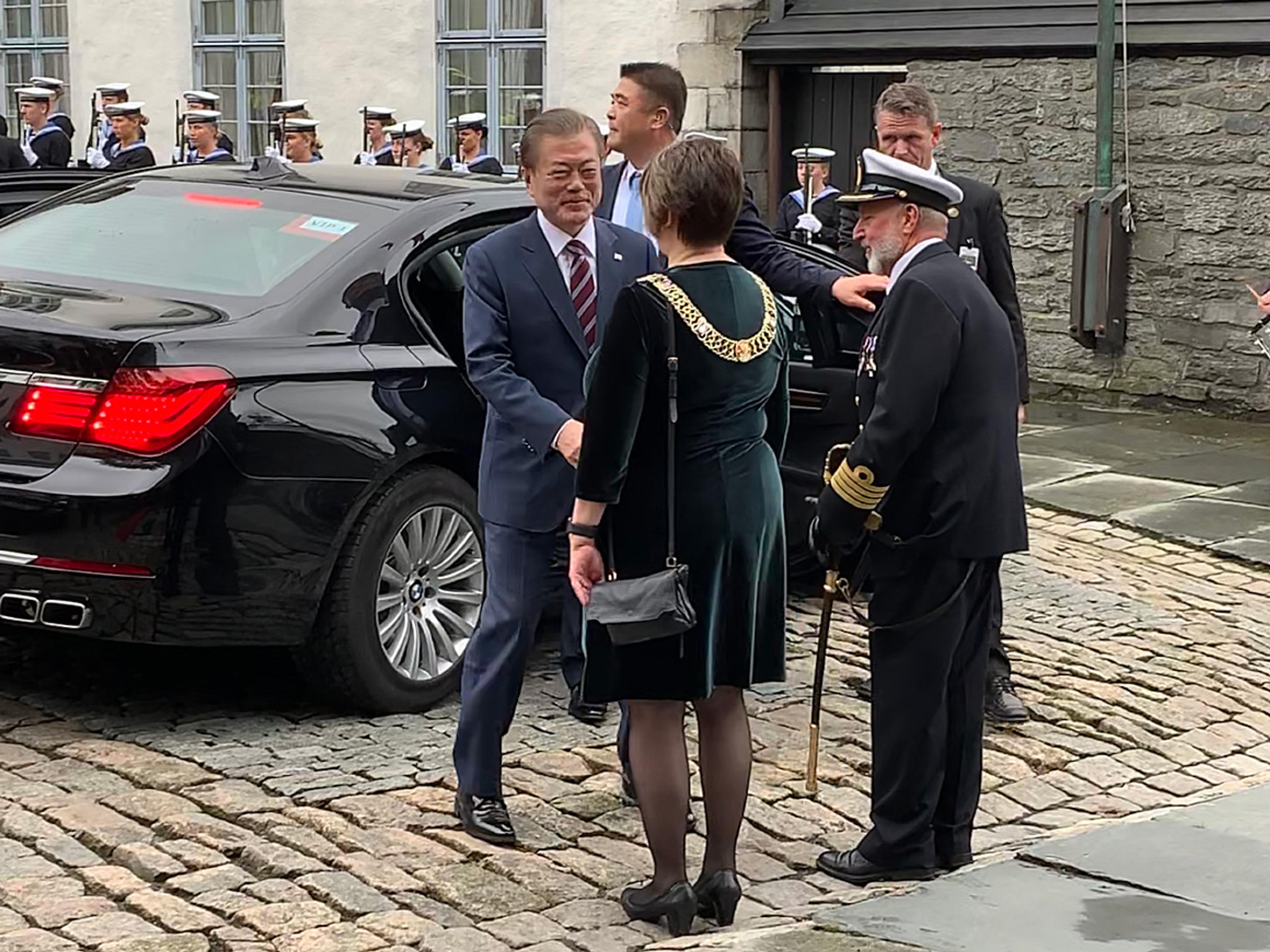 Hans Eksellense President Moon Jae-in møtte med statsminister Erna Solberg i dag morges, og følget ankom Bergen i formiddag. Dermed ble lunsj i Haakonshallen første post på programmet i vestlandshovedstaden. Ordfører Marte Mjøs var vert for arrangementet i den gamle kongehallen.