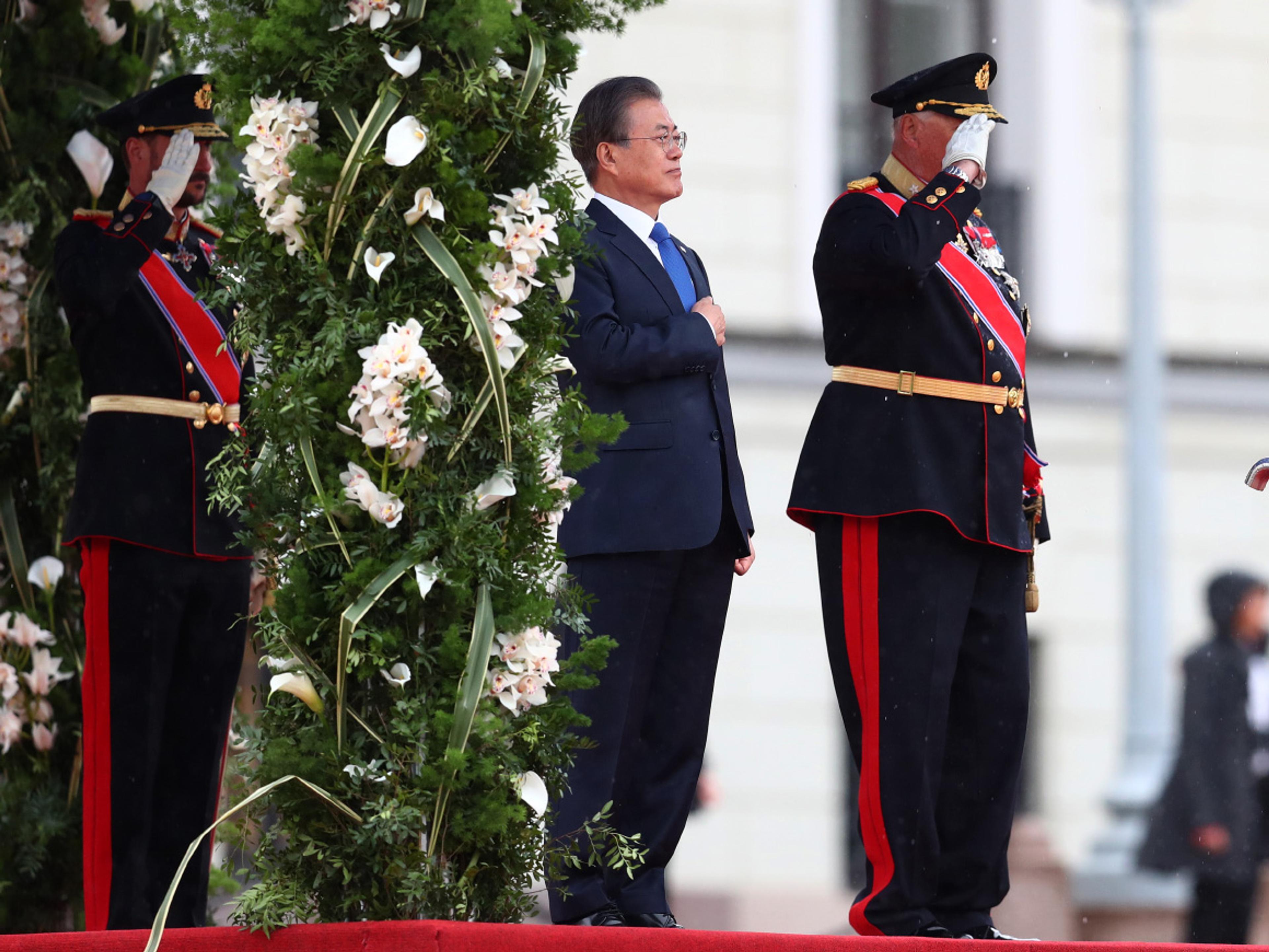 Kong Harald tok farvel med Presidentparet på Flesland. Nå reiser President Moon og fru Kim på Statsbesøk til Sverige, der Deres Majesteter Kong Carl Gustaf og Dronning Silvia vil ønske dem offisielt velkommen i morgen.