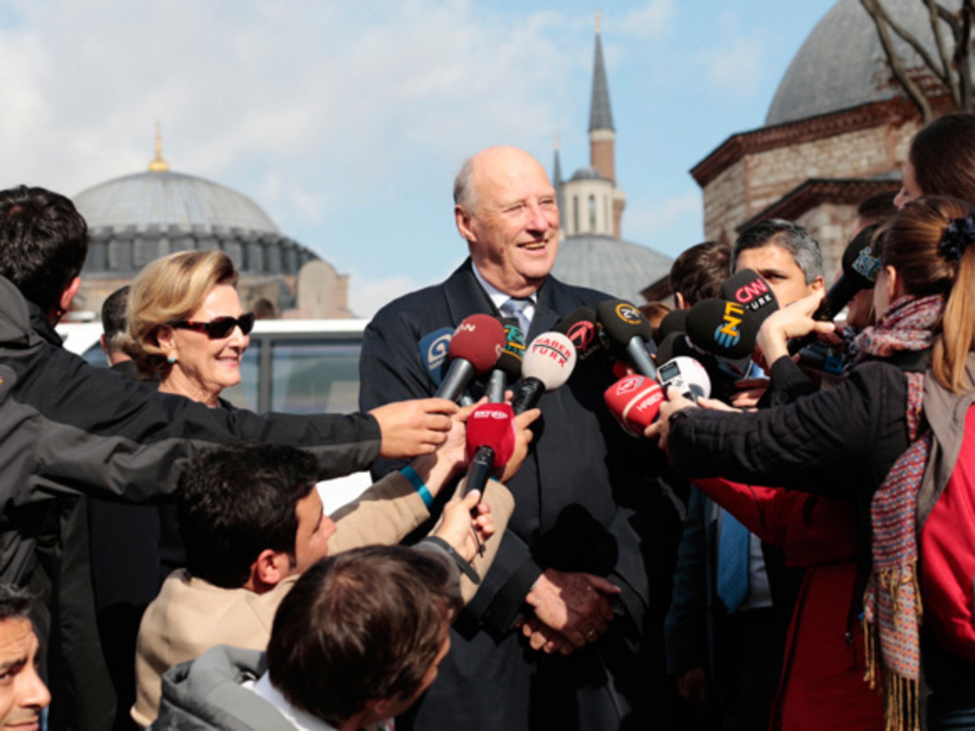 Deres Majesteter Kongen og Dronningen avslutter sitt statsbesøk til Tyrkia i dag. Etter å ha startet formiddagen på norsk-tyrkisk næringslivsseminar, fikk Kongeparet anledning til å besøke prkatbyggene Blå moské og Aya Sofia.